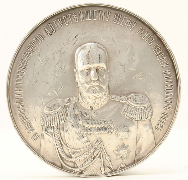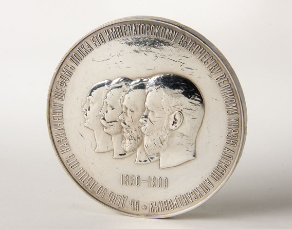 AN IMPERIAL RUSSIAN SILVER COMMEMORATIVE TABLE MEDAL, 1900. Commemorating the 50th anniversary of the appointment of Grand Duke Alexei Alexandrovich Romanov as Chief of the Moscow Life-Guards Regiment, 1850-1900. The obverse with a bust portrait of Grand Duke Alexei in uniform, and the verso with conjoined portraits of Tsars Nicholas II, Alexander III, Alexander II and Nicholas I. Inscribed in Russian, "To His Imperial Highness Grand Duke Alexei Alexandrovich on the day of 50th Anniversary of Appointment as Chief of Regiment." Diameter 3.125 inches (7.9 cm), total weight 257 grams.
