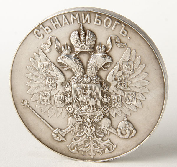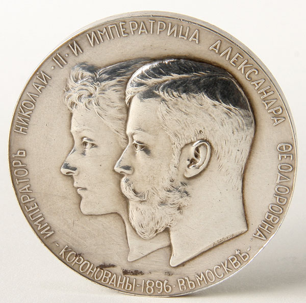 AN IMPERIAL RUSSIAN SILVER COMMEMORATIVE MEDAL, 1896. Commemorating the Coronation of Czar Nicholas II and Alexandra Feodorovna, Moscow 1896. The obverse with conjoined portraits of Nicholas II and Alexandra Feodorovna and verso with the Imperial Double Headed Eagle beneath the words, "God with Us." Contained in its original leather covered fitted case with impressed crown on lid. Diameter 2 inches (5.1 cm), total weight 78.8 grams.