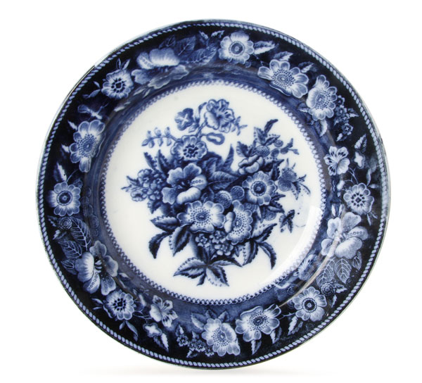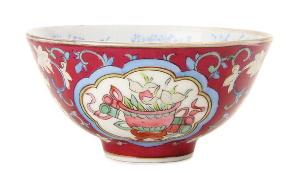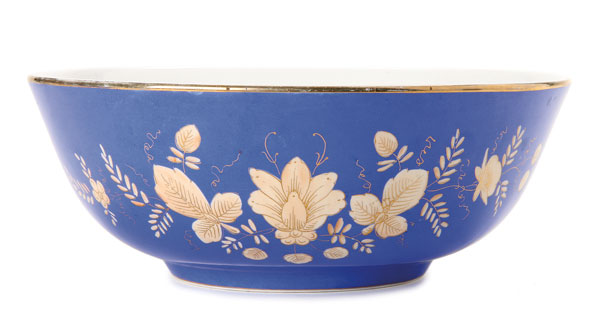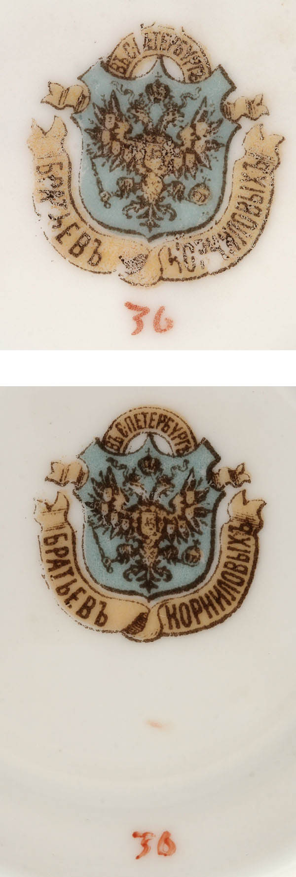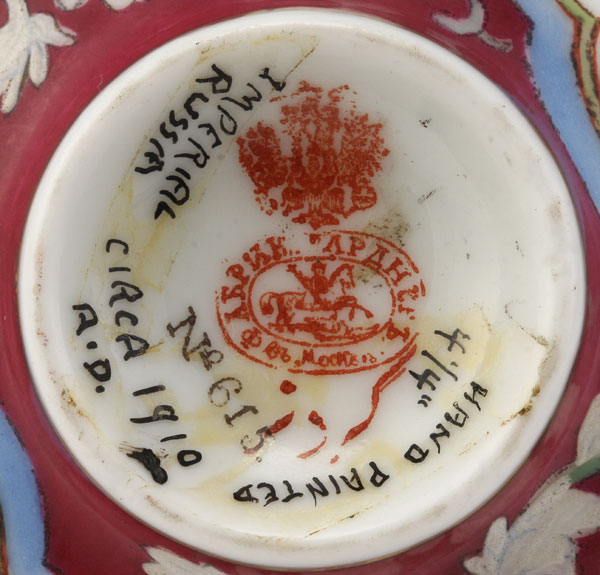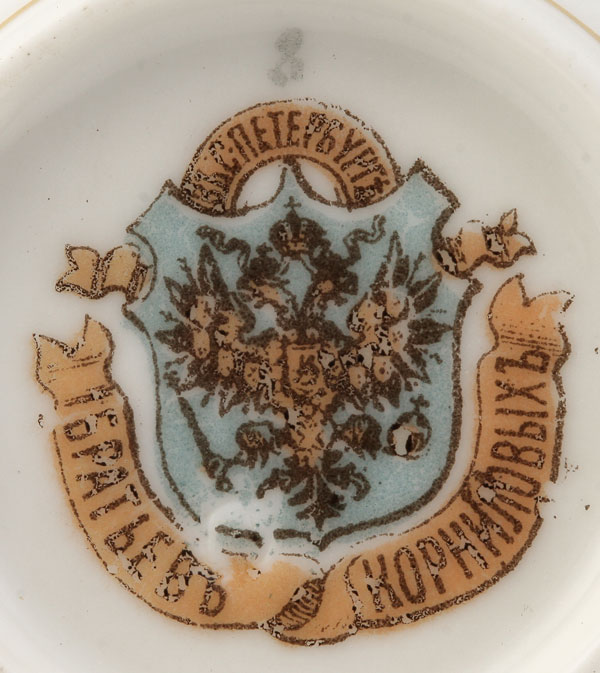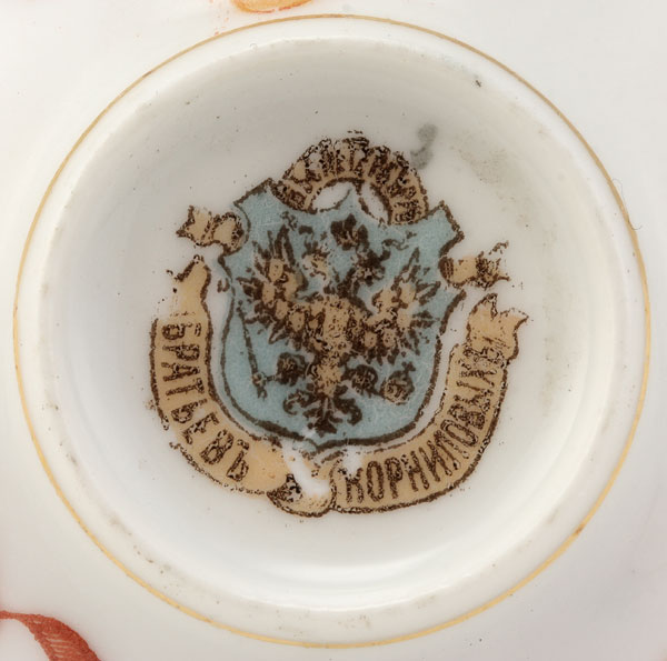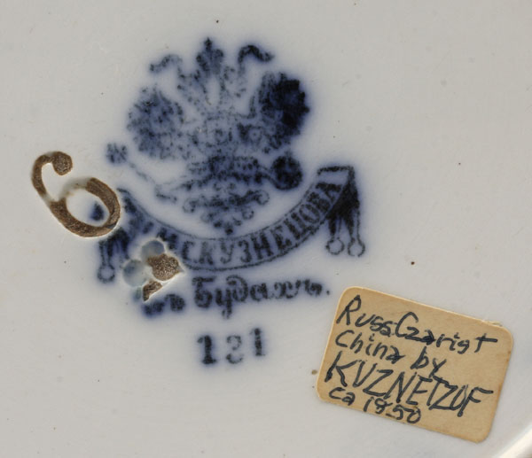 A GROUP OF IMPERIAL PERIOD RUSSIAN PORCELAIN, CIRCA 1850-1900. Comprising seven pieces in all, including a large fruit bowl with blue sides decorated with florals, the underside with red mark of Gardner beneath the Imperial Warrant, diameter 9.6 inches (24 cm); a cobalt blue transfer ware floral decorated bowl, circa 1850, blue underglaze mark of Kuznetsov, diameter 9.2 inches (23.4 cm); a pair of matching tea cups and saucers with burnt red floral decoration on a white ground and with gilt rims, underside with mark of Kornilov beneath the Imperial Warrant, saucer diameter 4.75 inches (12 cm); and a footed handless teacup with floral decoration on a violet red ground and the inner rim banded in Arabic script, diameter 4.25 inches (10.7 cm).