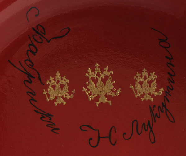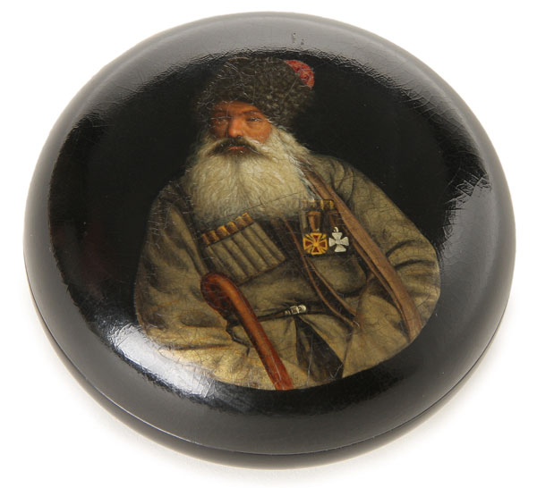 A FINE RUSSIAN LACQUERWARE ROUND LIDDED BOX, LUKUTIN, CIRCA 1890.The fitted lid painted with a decorated old Cossack soldier, his garments under painted with lustrous ground mica ( a Lukutin trademark) and the interior in red lacquer with Lukutin factory mark beneath three gold Imperial Warrants. Diameter 3.25 inches (8.3 cm).