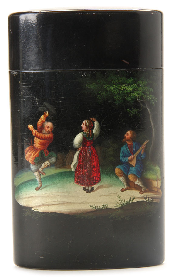 A FINE RUSSIAN LACQUER WARE VESTA CASE, LUKUTIN, CIRCA 1890. The front painted with a scene of peasant’s dancing to the tune of a balalaika player, the interior in red lacquer and the over-fitting lid marked with the Lukutin mark beneath the Imperial Warrant. Length 4.25 inches (10.8 cm).