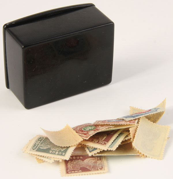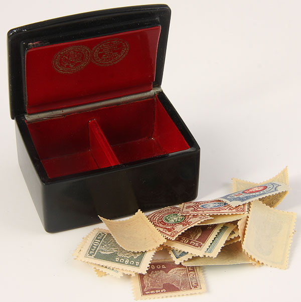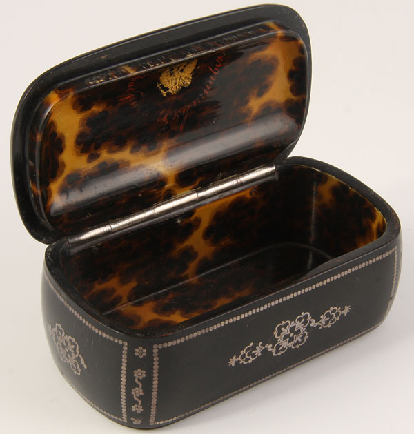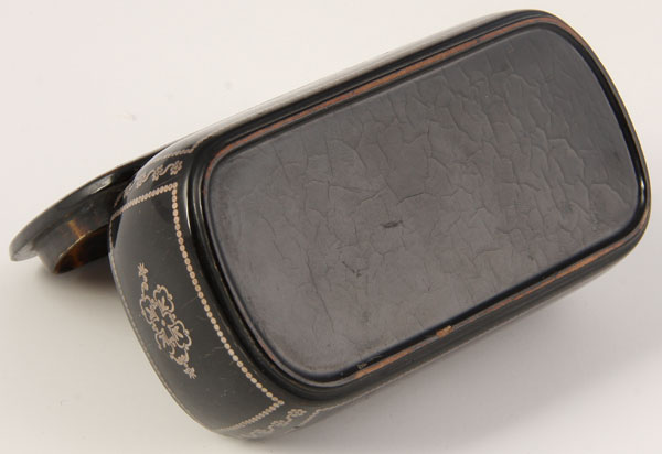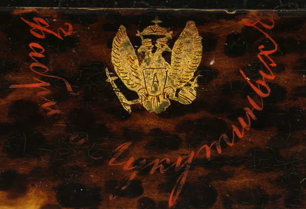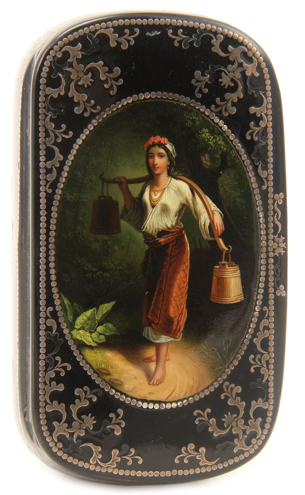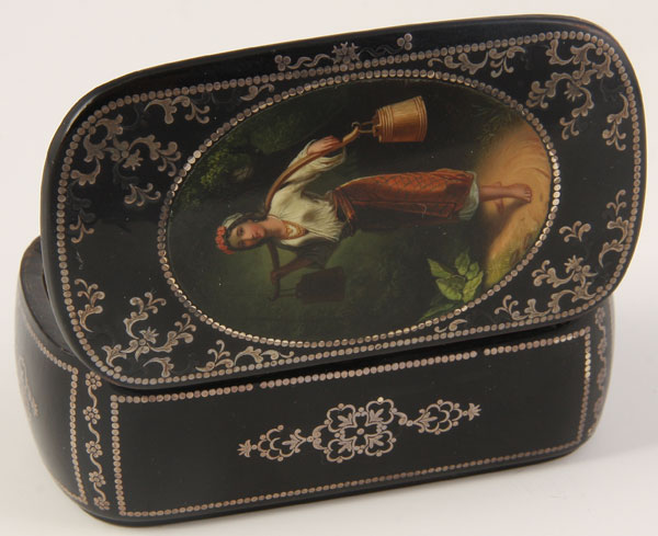 A FINE RUSSIAN LACQUERWARE AND SILVER INLAY BOX, LUKUTIN, CIRCA 1880. The hinged lid painted with a peasant girl carrying water and overall inlaid with silver. The interior painted in faux tortoise shell and with Lukutin mark beneath the Imperial Warrant. Length 3.75 inches (9.5 cm). Together with a small lacquerware stamp box the hinged lid painted with a winter troika scene and the interior with indistinguishable mark over red lacquer, probably Vishniakov. Length 2.25 inches (5.8 cm).
