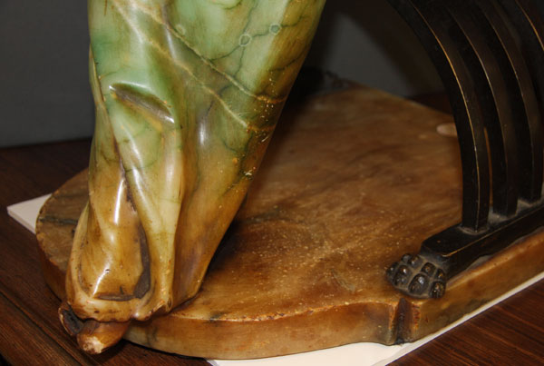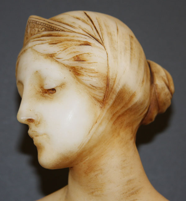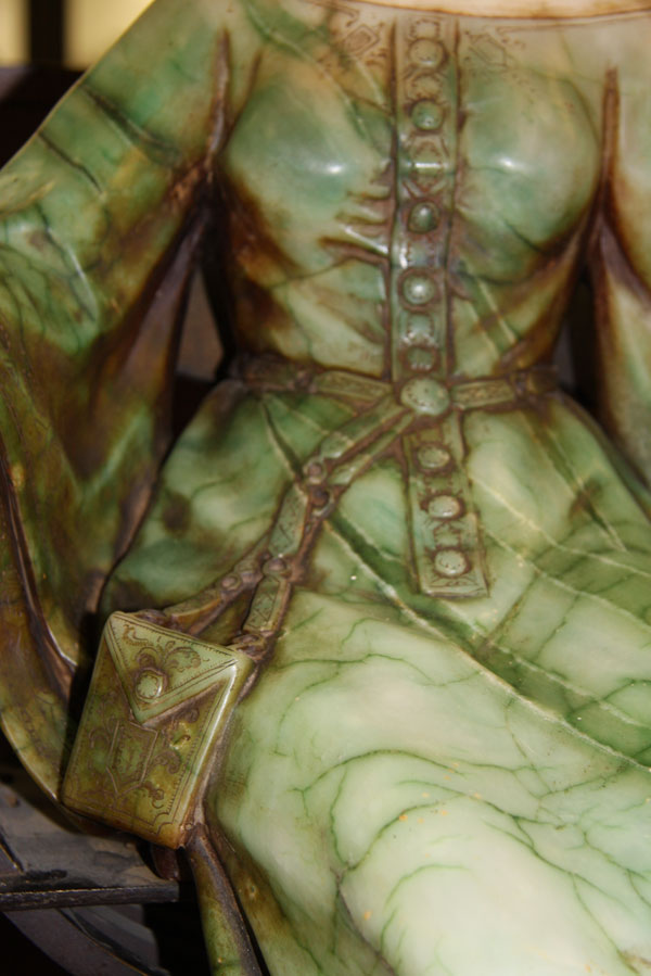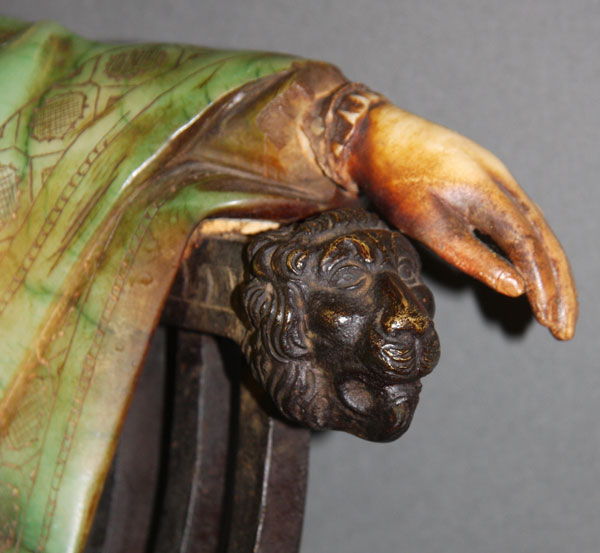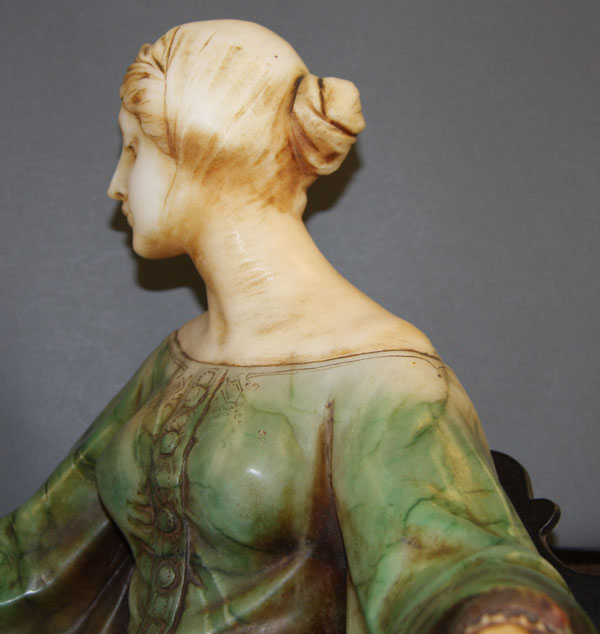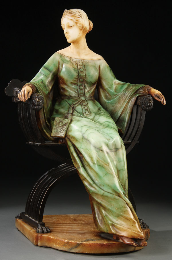 EMILIO FIASCHI (ITALIAN 1858-1941), "AN RENAISSANCE SEATED BEAUTY". Polychrome carved alabaster and bronze, depicting a fully carved figure of a Renaissance style woman in tinted alabaster seated on a bronze "savonarola" chair raised on an alabaster plinth. Marked "P.C.E. Fiaschi, Firenze, Made in Italy". Height 25.75 inches (65.5 cm).