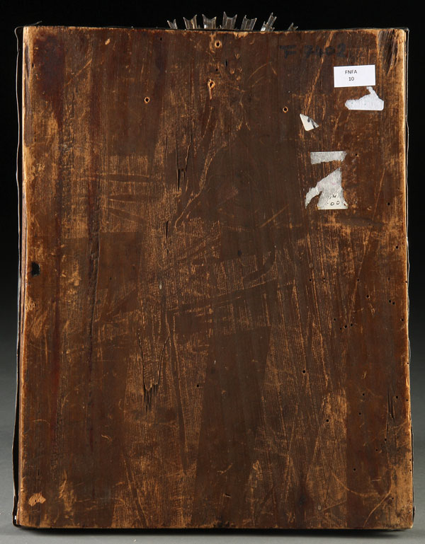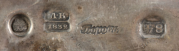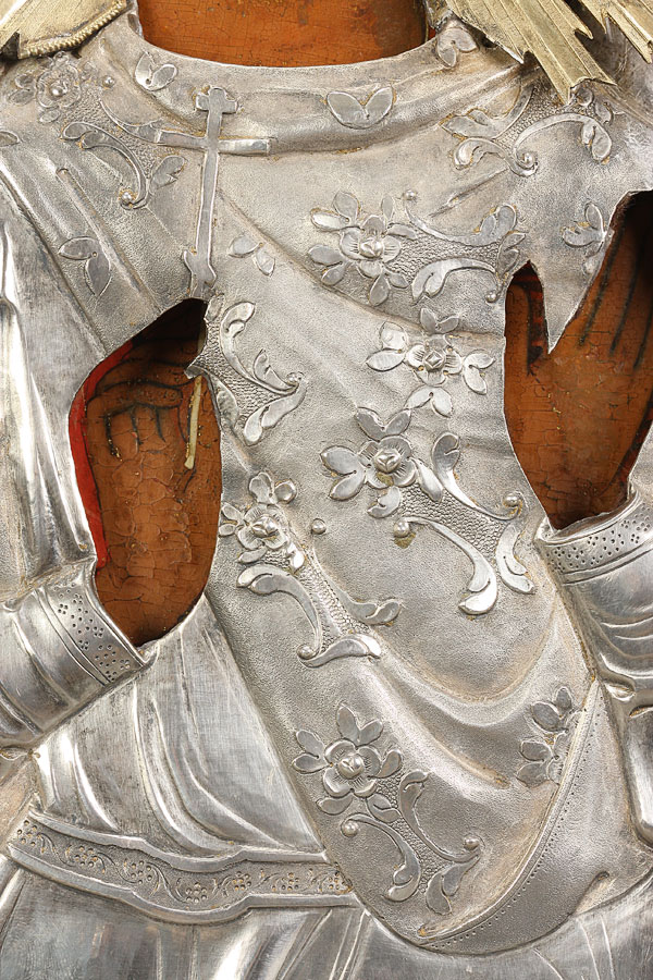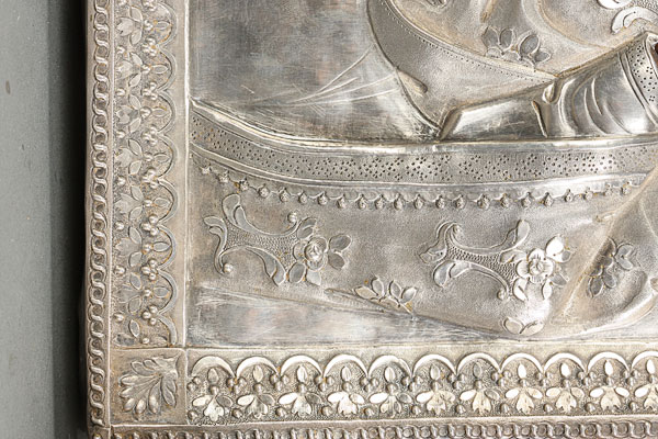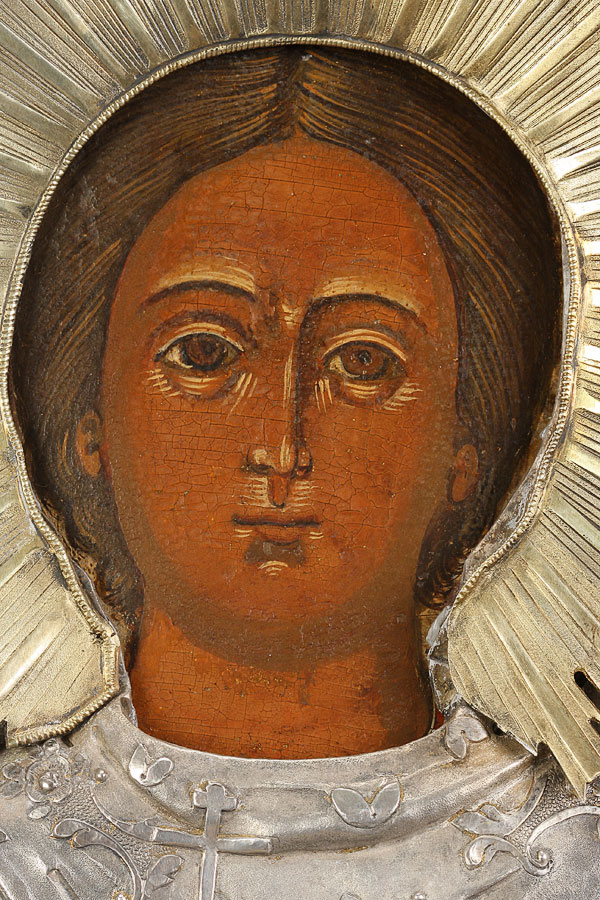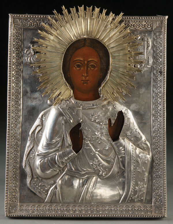 A RUSSIAN ICON OF SAINT PANTELEIMON, CIRCA 1825.The entire image overlaid with a heavy repousse and chased silver riza with attached halo, hallmarked St. Petersburg, dated 1832, stamped with the Cyrillic makers name Borov and 84 silver standard. The upper corner inscribed "The Holy Great Martyr and Healer Panteleimon."  12.5 inches x 10 inches (31.7 x 25.4 cm).