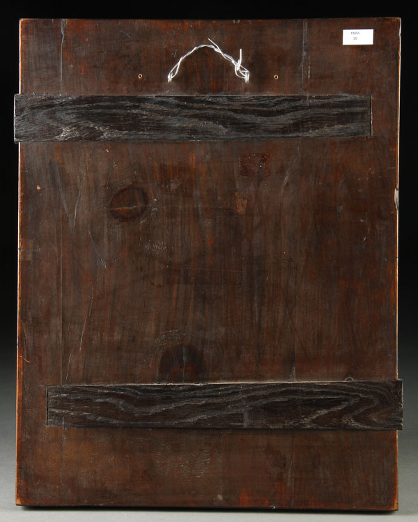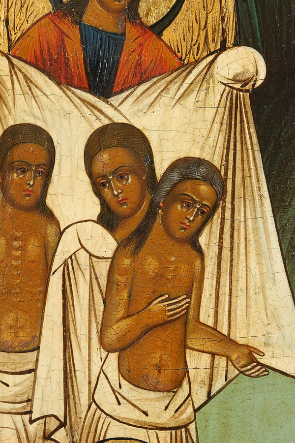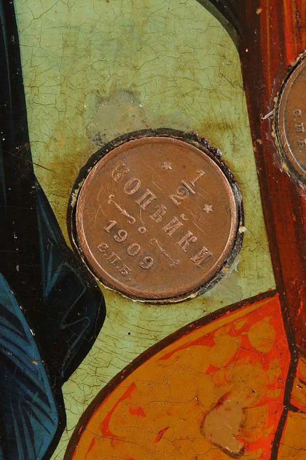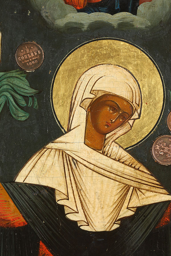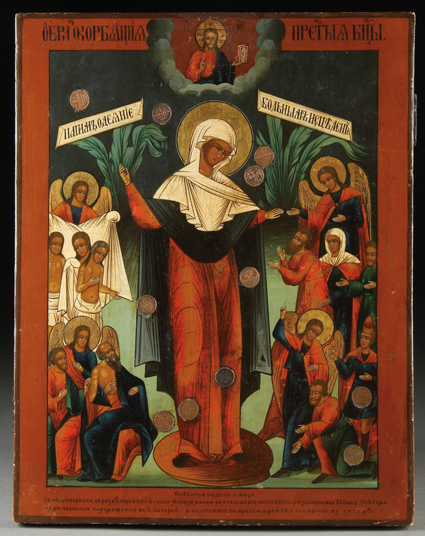 AN INTERESTING RUSSIAN ICON OF THE MOTHER OF GOD JOY TO ALL WHO SUFFER, WITH COINS, CIRCA 1890. This icon type originated in a miracle that took place in the village of Klochka, near St. Petersburg, not far from a glass factory, in the year 1888. A standard image of the Joy to All Who Suffer was hanging in a chapel that was struck by lightning, which shattered the alms box and charred the walls. The icon Joy to All Who Suffer was found face down with coins sticking to the surface and had brightened which was seen as a sign from heaven. While it is not uncommon to find examples with coins painted on the surface it is less common to find actual ½ kopek coins inlaid such as in the offered lot. The inscription on the lower margin states that this is a true likeness of the same icon which was discovered on July 23, 1888 in the chapel near the Glass factory.  16.75 inches x 13 inches (42.5 x 33 cm).