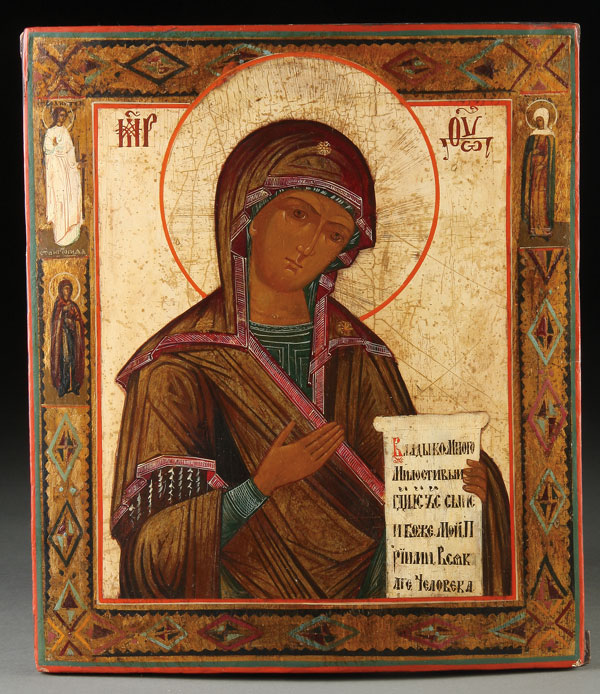 A RUSSIAN ICON OF THE MOTHER OF GOD, CIRCA 1890. The borders with the Guardian, Angel St. Antonida and Elena. 14 inches x 12.25 inches (35.5 x 31 cm).
