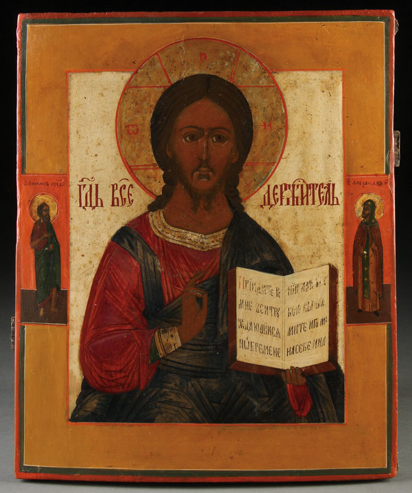 A RUSSIAN ICON OF THE LORD ALMIGHTY, 19TH CENTURY.Christ delivers a blessing and holds an open book of gospels to Matthew 11:28. The borders with St. John the Forerunner and Alexander Nevsky. 14.25 inches x 11.75 inches (36.2 x 29.8 cm).