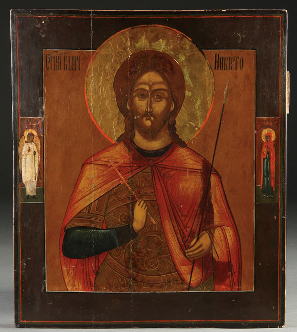 A RUSSIAN ICON OF ST. NIKITA, 19TH CENTURY. The borders with the Guardian Angel and the prophetess Anna. 14 inches x 12 inches (35.5 cm x 30.7 cm).