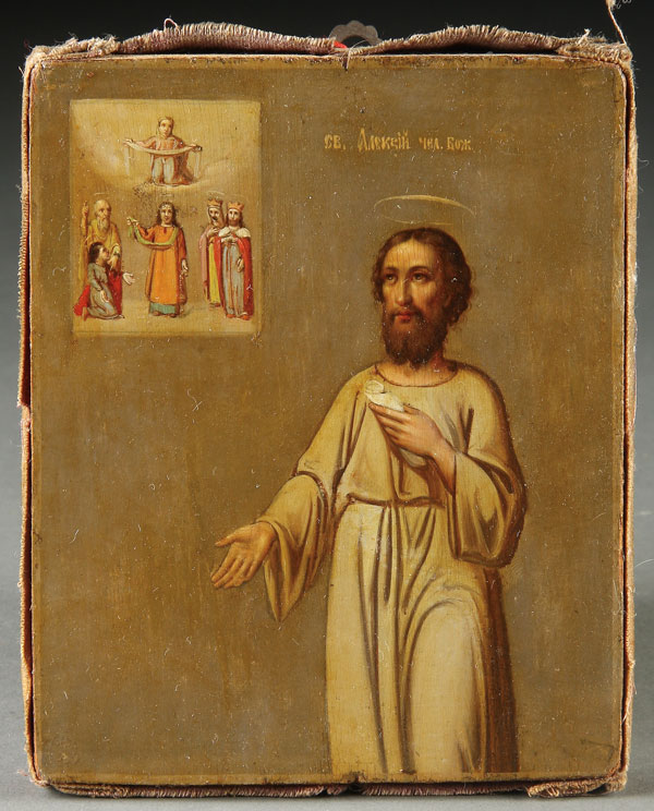 A RUSSIAN ICON OF ST. ALEXI, 19TH CENTURY. Here Alexi, the Holy Fool, is seen in simple clothing before an icon of the Pokrov Mother of God. The abbreviated inscription above his head identifies him as The Holy Alexi Man of God.  5.25 inches x 4.25 inches (13.3 x 10.8 cm).