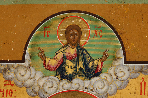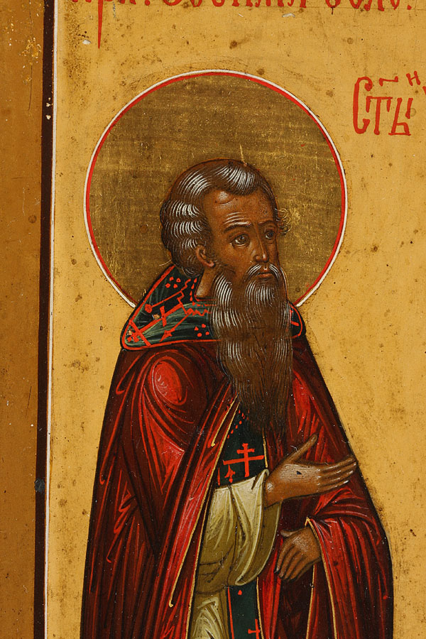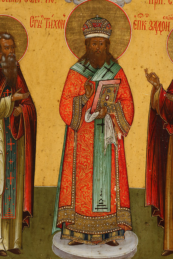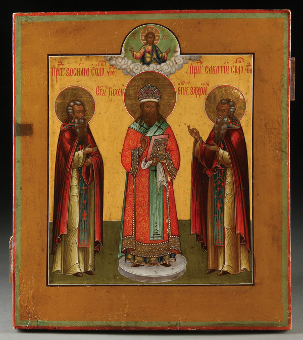 A RUSSIAN ICON OF ST. TIKHON WITH SAINTS ZOSIMA AND SAVATII, 19TH CENTURY. 14 inches x 12.25 inches (35.6 cm x 31.1 cm).
