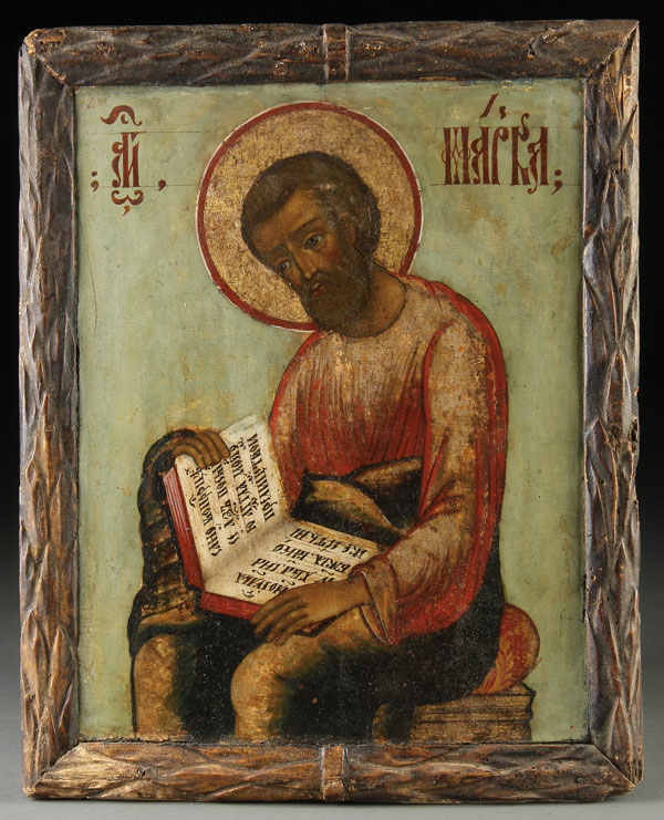 A RUSSIAN ICON OF THE APOSTLE ST. MARK, CIRCA 1700.Here the writer of the second Gospel is seated with an open book resting in his lap and upon which is inscribed the beginning of his own Gospel, “The beginning of the gospel of Jesus Christ the Son of God.” Most likely once part of a set of Evangelists from a pair of Royal doors and clearly echoing the Moscow Armory School style. 16 inches x 13 inches (40.6 x 33 cm).