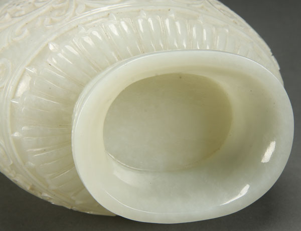 A VERY FINE CHINESE MUGHAL STYLE COVERED VASE, IN FINELY DETAILED CARVED WHITE JADE, LATE QING/EARLY REPUBLIC PERIOD. Of flattened ovoid form carved in a pale celadon colored white jade, with scrolled foliates in deep relief below figural elephant head handles with suspended loose rings surmounted with a domed cover carved with a cloud form finial. Height 12.5 inches (32 cm).