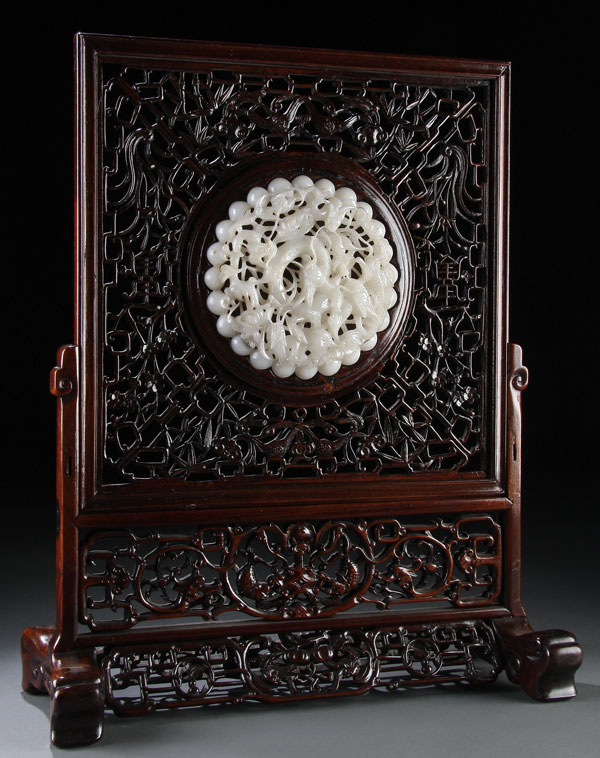 A FINE LARGE AND IMPRESSIVE CHINESE CARVED WHITE JADE AND HARDWOOD TABLE SCREEN. The large white jade plaque finely carved and pierced with an openwork design of five scrolling dragons among undulating lotus blossoms set in a carved zitan or rosewood reticulated screen decorated with bats, fungus, bamboo shoots and prunus displayed in a matching stand. The jade diameter 6 inches (15 cm), total height 19.5 inches (49.5 cm).