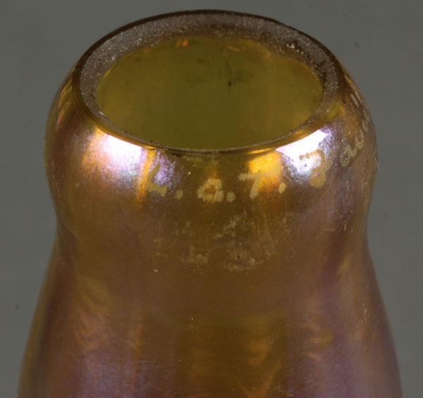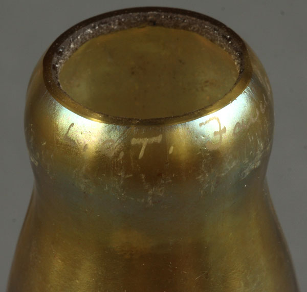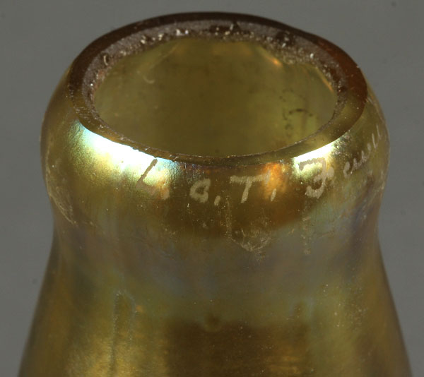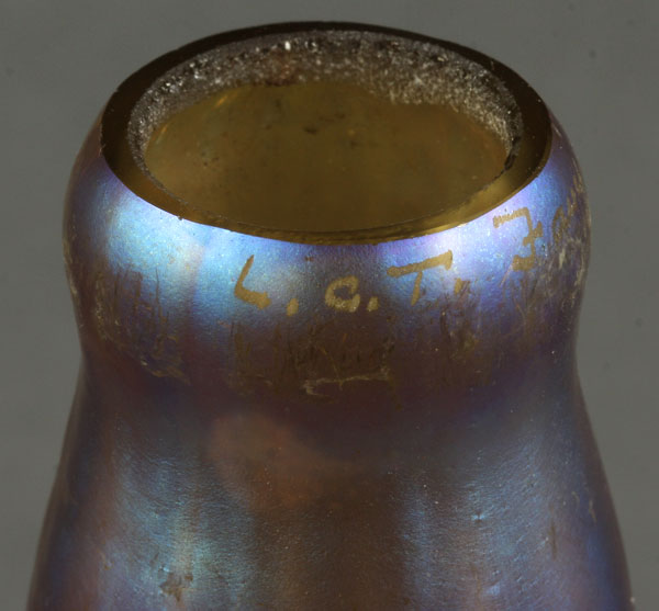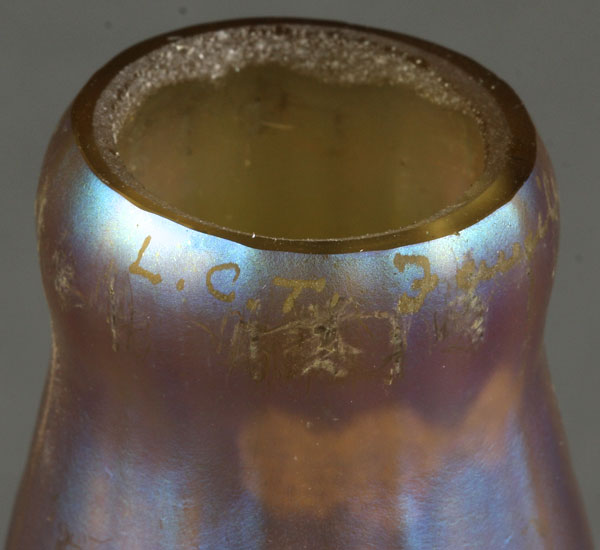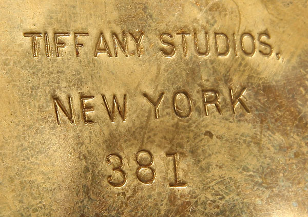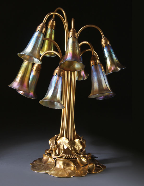 A FINE TIFFANY STUDIOS GILT BRONZE AND FAVRILE GLASS TEN LIGHT LILY LAMP, EARLY 20TH CENTURY. The floriform stems with iridized gold Favrille glass lily form shades rising from a lily leaf sculpted gilt bronze base. Stamped "Tiffany Studios New York 381." Nine shades each inscribed "L.C.T. Favrille," one shade a later replacement. Note: Needs wiring. Height 21 inches (53.5 cm).