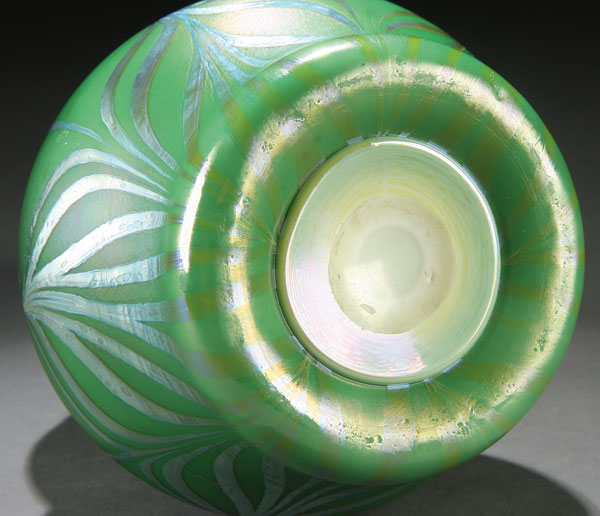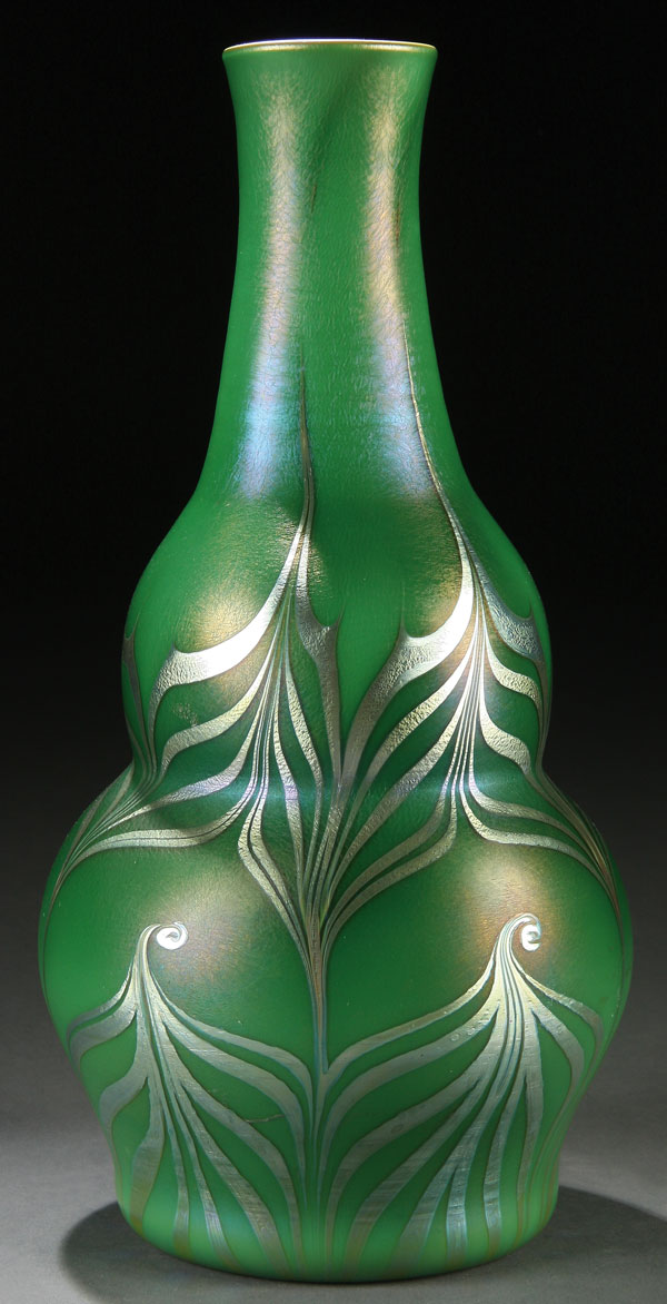 A VERY FINE L.C. TIFFANY GREEN FAVRILE HOOKED FEATHER DOUBLE GOURD VASE, CIRCA 1900.With a silvery and purple highlighted hooked feather design over an iridized emerald gold finish, with an interior of silvery purple iridized luster. The unsigned round button pontil inscribed with the letter V. Height 10.5 inches (27 cm).