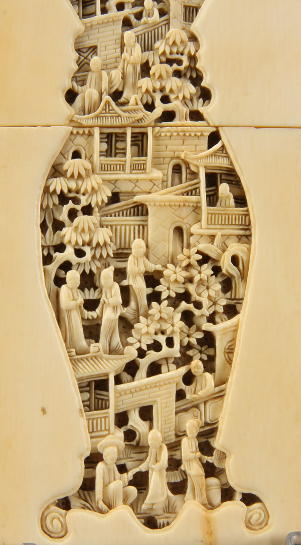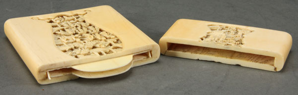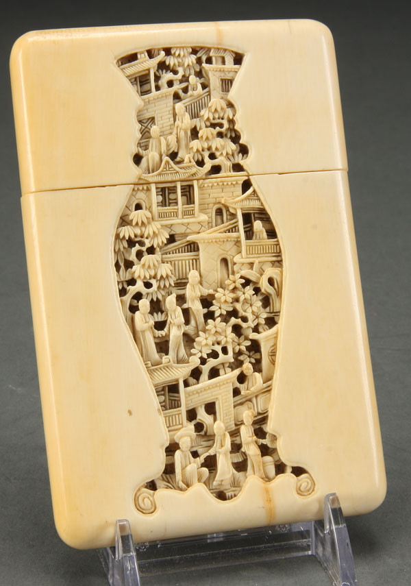 A FINE CHINESE EXPORT CARVED IVORY CALLING CARD CASE, 19TH CENTURY. Of flat rectangular form with rounded edges carved with a dimensional courtyard scene of figures, pavilions and trees in recessed ground. 4.5 inches x 3 inches (11.5 cm x 7.5 cm).