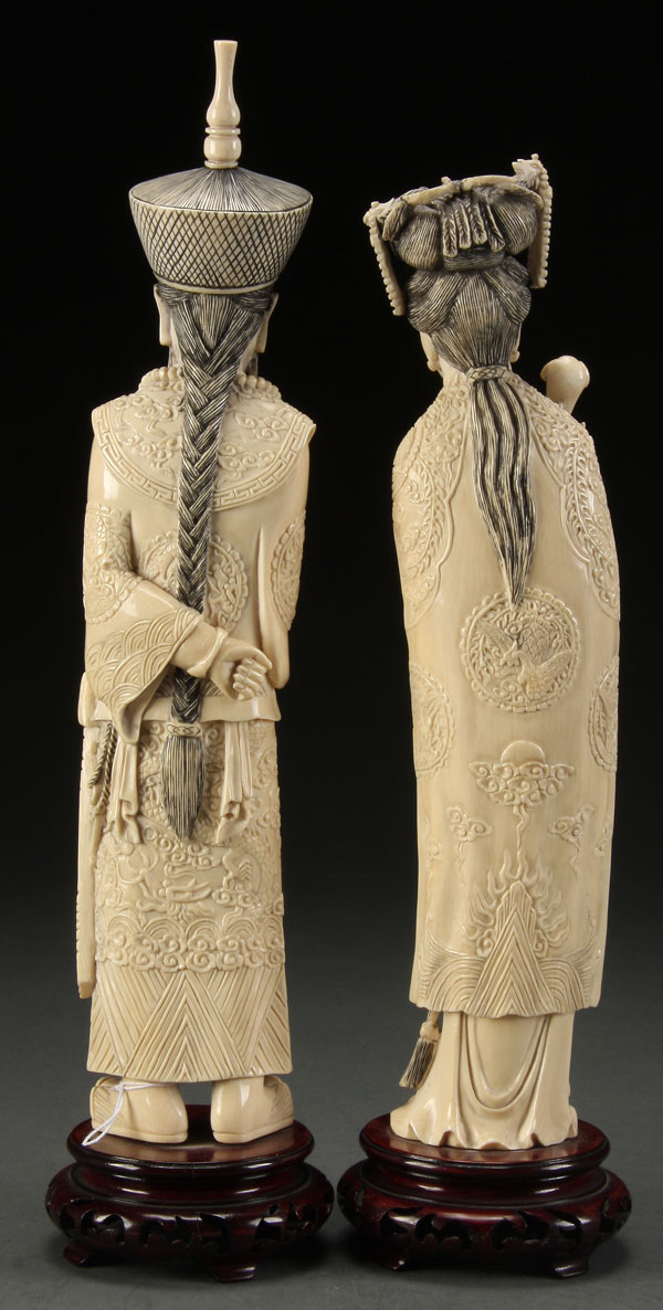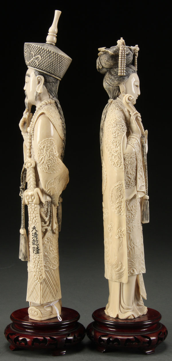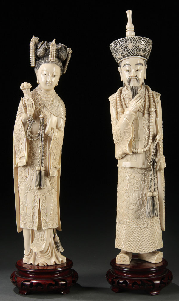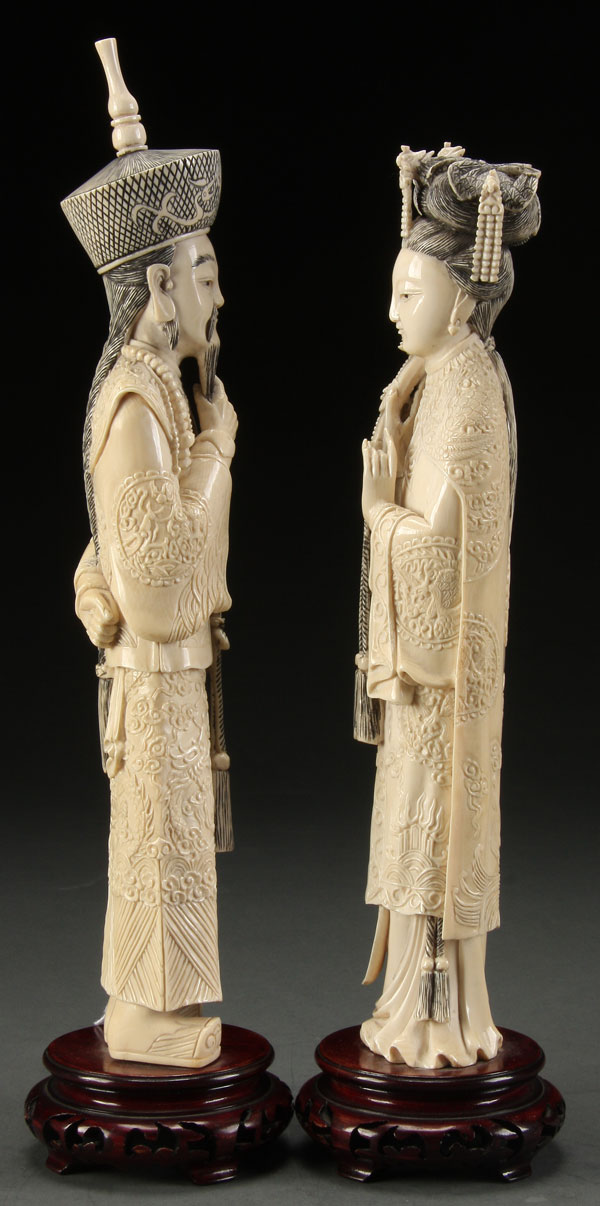 A LARGE AND VERY FINE PAIR OF CHINESE CARVED IVORY EMPEROR AND EMPERESS FIGURES, LATE 19TH/EARLY 20TH CENTURY. Each finely carved in high detail with elaborate gowns decorated with dragons, cloud forms and fungus; the emperor stroking his beard, the Empress holding a ruyi scepter. Each raised on a carved and reticulated hardwood base. Ivory height 12 inches and 13.5 inches (30.5 cm and 34 cm).