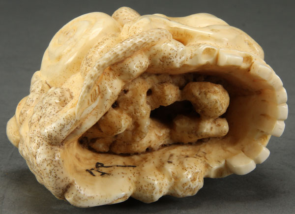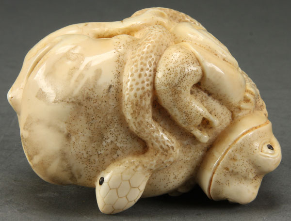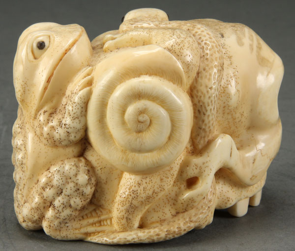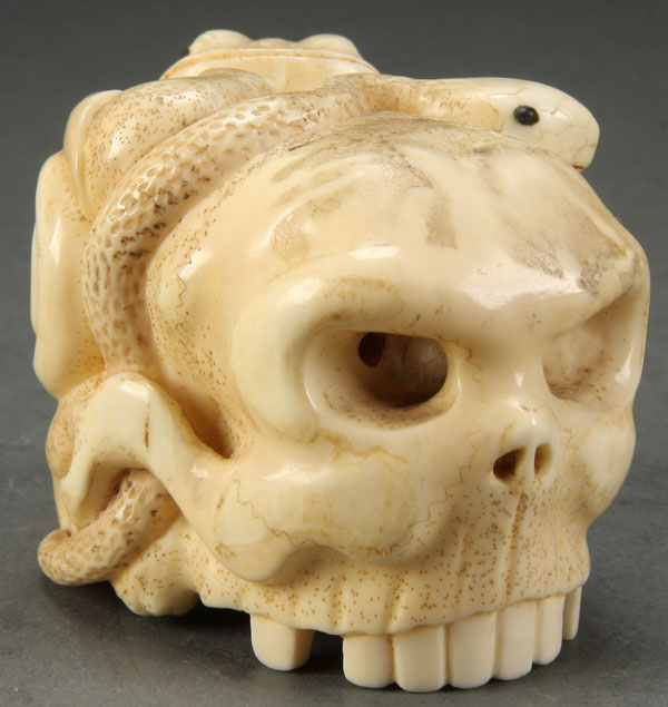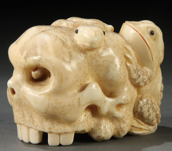 A GOOD JAPANESE CARVED IVORY OKIMONO OF A SKULL, PROBABLY MEIJI PERIOD. In the form of a human skull with a figural snail, toad and snake, the latter two with inlaid jet eyes. Height 2.25 inches (5.5 cm), length 3.25 inches (8.3 cm).