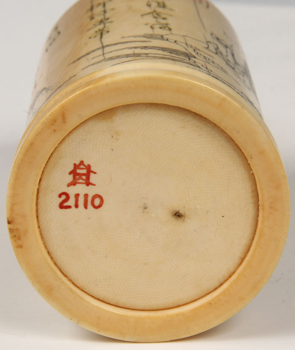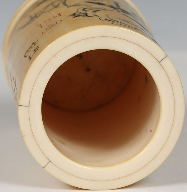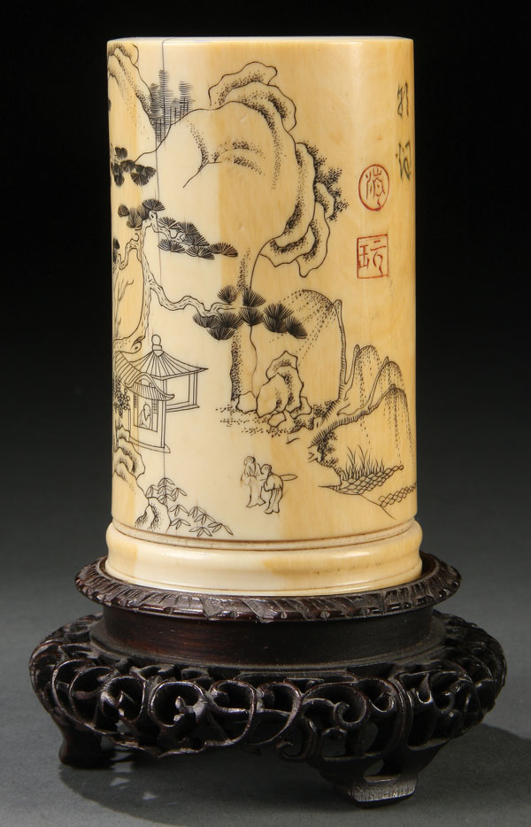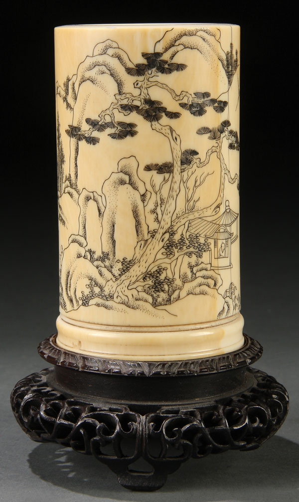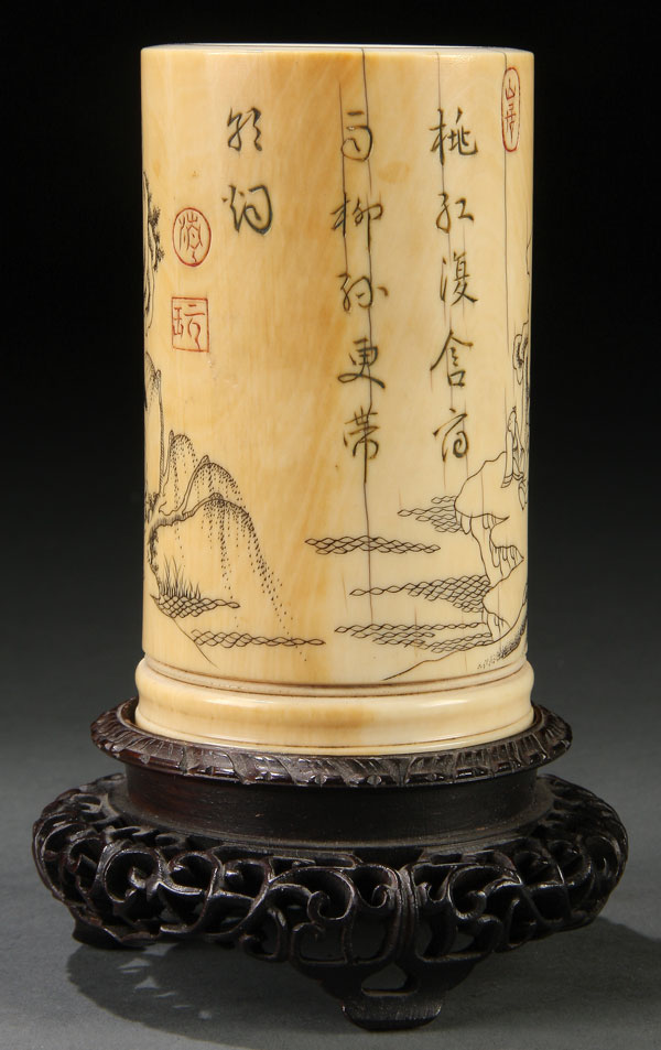 A VERY FINE CHINESE CARVED IVORY BRUSH POT, 18TH/19TH CENTURY. Of cylindrical form with a shaped foot rim finely incised with figures in a mountainous setting and engraved with an inscription. Height 4 inches (10 cm) (ivory). Raised on a carved hardwood stand.