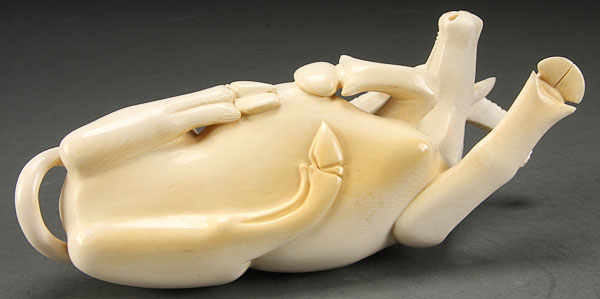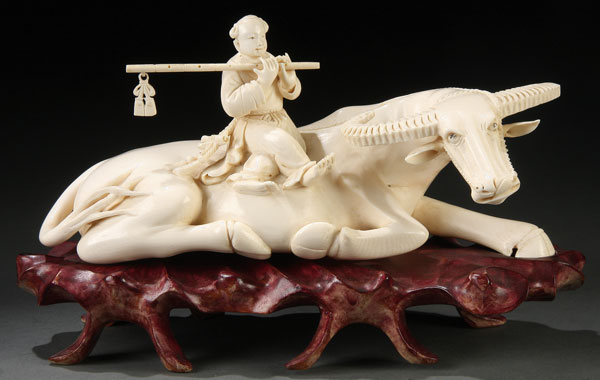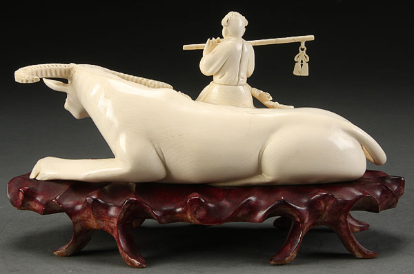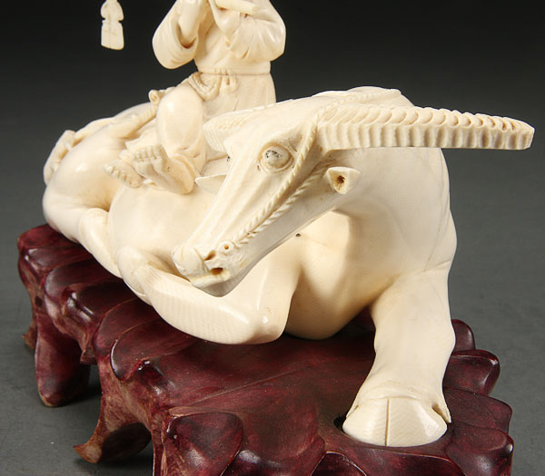 A LARGE CHINESE CARVED IVORY FIGURE OF A BOY ON KERBAU (WATER BUFFALO), 20TH CENTURY. The well sculpted form of a recumbent water buffalo surmounted by a young boy playing a dizi (flute) and raised on a conforming carved hardwood stand. Length (ivory) 10 inches (25.5 cm).