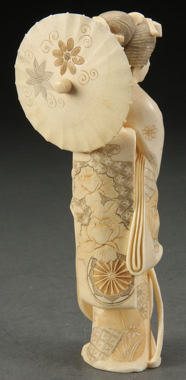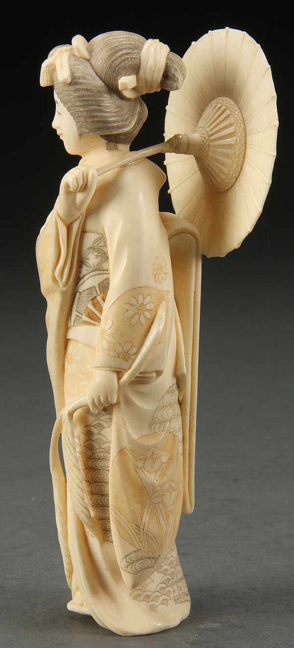 A VERY FINE JAPANESE CARVED IVORY OKIMONO OF A GEISHA, PROBABLY MEIJI PERIOD.Depicting the young beauty with a traditional shimada wearing a finely incised decorated kimono and holding a parasol. Inlaid tortoise shell maker's block on base. Height 6 inches (15.25 inches).