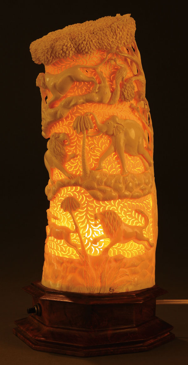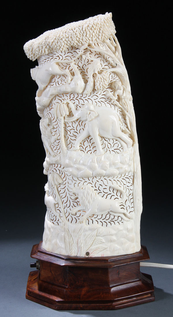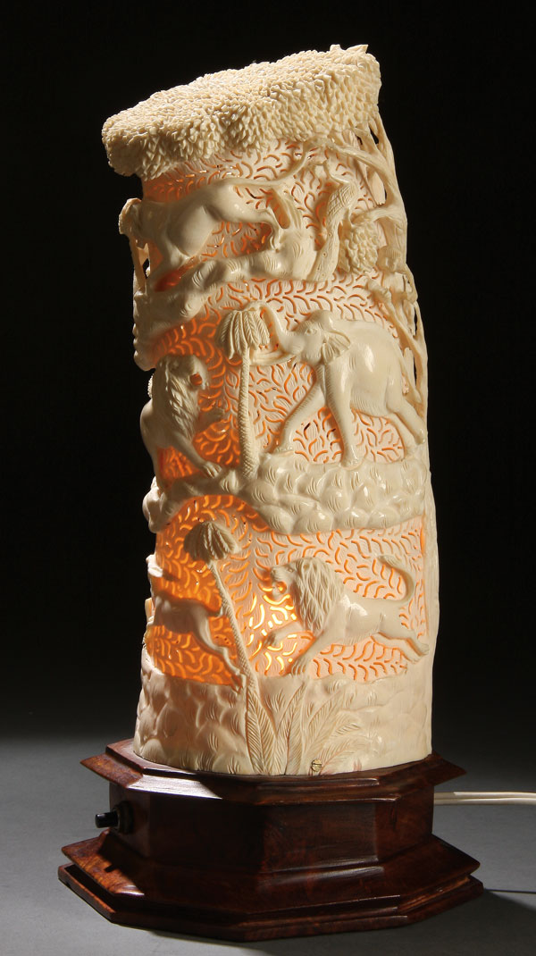 A VERY FINE CHINESE CARVED IVORY LUMINAIRE, MID 20TH CENTURY. Of curved cylindrical form deeply carved and pierced with a scene of elephants battling lion, deer, peacocks and pine trees against a reticulated foliate ground and raised on a shaped hardwood plinth. The ivory height 11.75 inches (30 cm) and 13.5 inches (35 cm) overall.