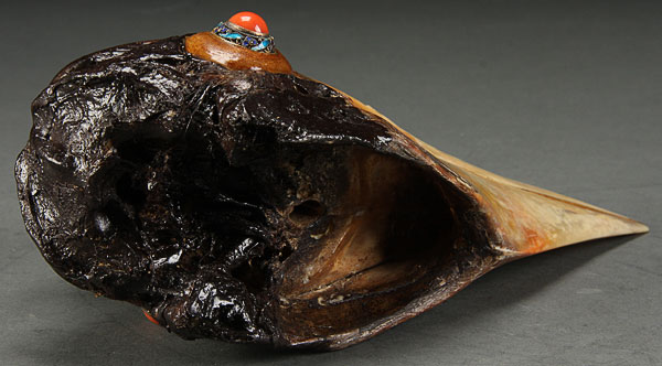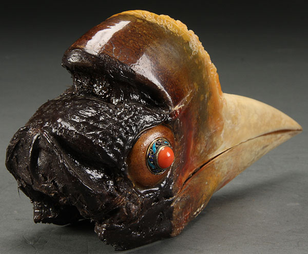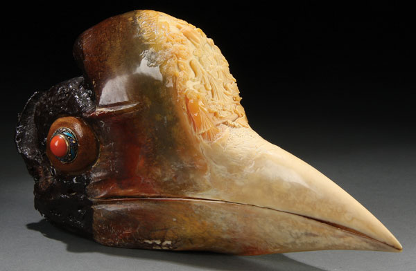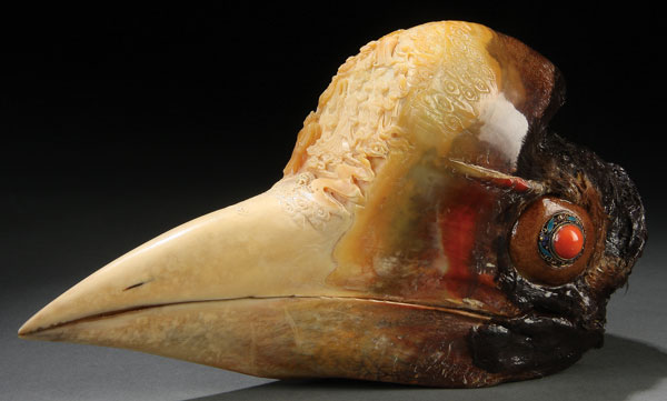 A CHINESE CARVED HORNBILL AND CORAL MOUNTED CASQUE, 20TH CENTURY.The Hornbill skull carved on the frontal lobe with a relief scenic panel of immortals rising on cloud forms and eye sockets mounted with polished coral cabochons set in cloisonné enameled bezels. Length 8.5 inches (21.5 cm).