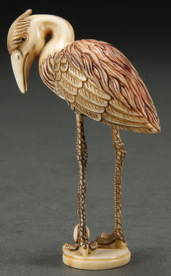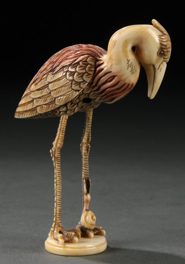 A FINE JAPANESE CARVED IVORY NETSUKE OF A TSURU (JAPANESE CRANE), 20TH CENTURY. Finely carved and well detailed depicting a standing crane with snail at left leg. Inscribed signature under base. Height 3 inches (7.5 cm).