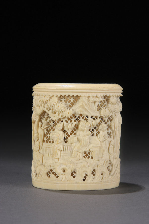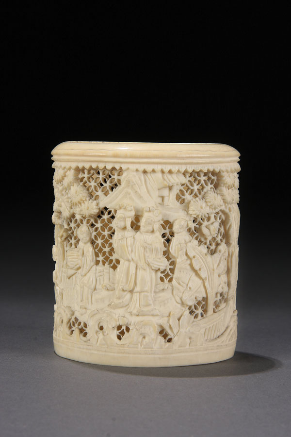 A CHINESE CARVED IVORY CYLINDER, EARLY 20TH CENTURY.Finely carved with a detailed scene of immortals and attendants on a reticulated ground. Height 3.125 inches (8 cm).