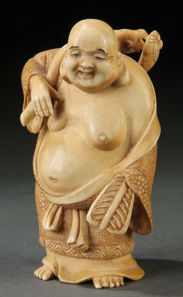 A JAPANESE CARVED OKOMONO OF HOTEL, MEIJI PERIOD. Depicting the God of happiness in well-carved detail. Incased chip on base. Height 3 inches.
