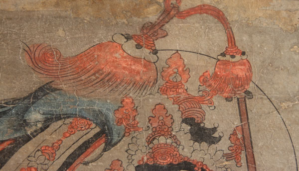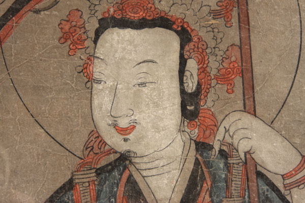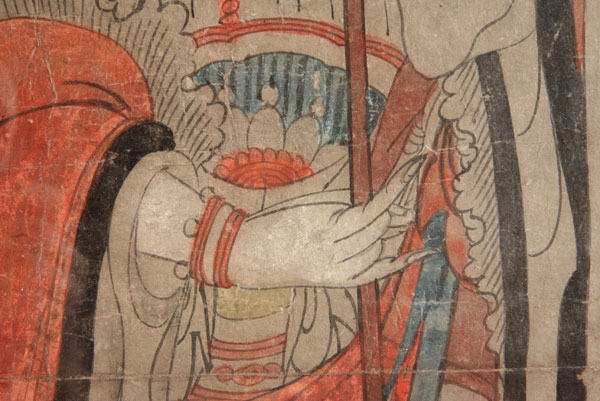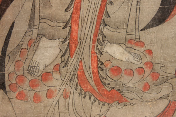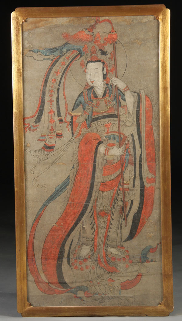 A VERY FINE JAPANESE PAINTING OF BUDDHA, LATE EDO, EARLY MEIJI PERIOD.Ink and watercolor on paper, depicting the standing form of Buddha with staff wearing red oxide and indigo blue robes, some losses and restorations. 21 inches x 44 inches (53.2 x 112 cm), contained in a later glazed gilt wood frame.