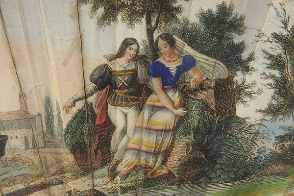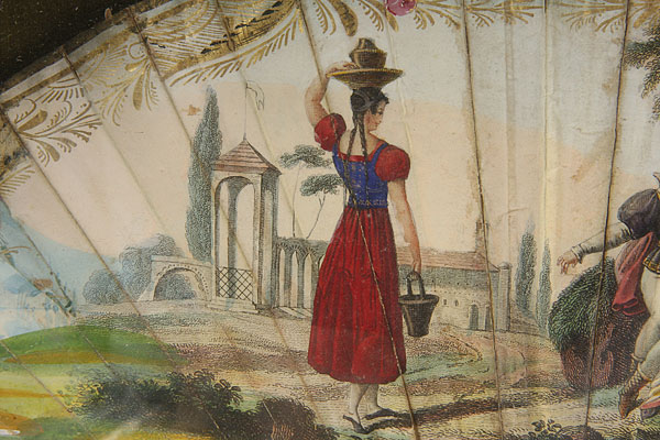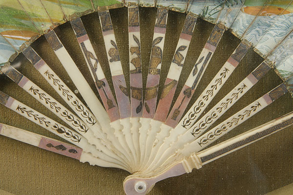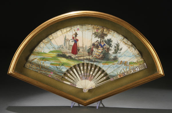 A FINE NEOCLASSIC CARVED IVORY AND HAND PAINTED FOLDING FAN, CIRCA 1800.The hand carved reticulated ivory sticks with mother of pearl inlay and gilt decoration supporting a neoclassic pastoral engraved and hand decorated paper pleated fan. Indistinguishably signed lower right and contained in a later gilt and glazed shadow box frame. 9.5 inches x 11.75 inches (24 x 30 cm).