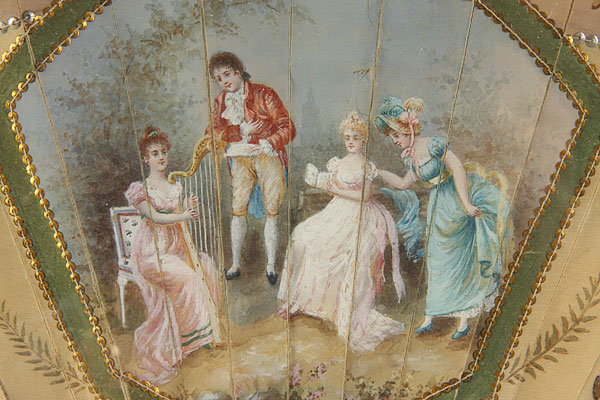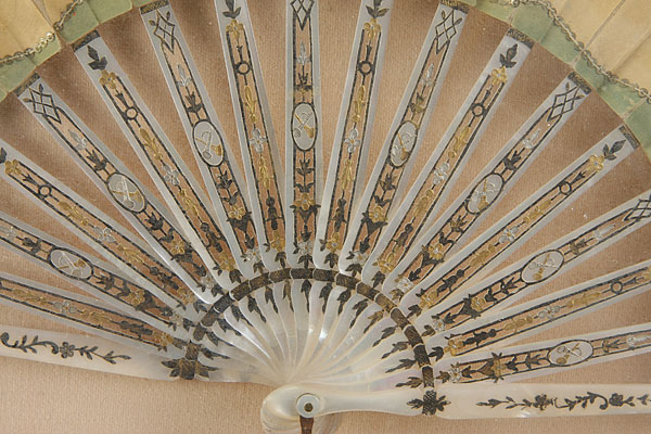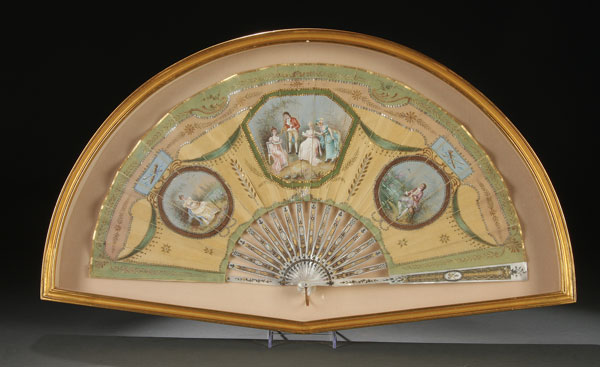 A VERY FINE FRENCH LOUIS XVI HAND PAINTED AND CARVED MOTHER OF PEARL SILK FOLDING FAN, CIRCA 1900. The hand carved mother of pearl sticks with very fine reticulated and tooled decoration heightened in silvering and gilt, supporting a silk pleated semi-circular fan with three hand painted romantic pastoral scenes set in reserves within foliate and beaded swag borders. Artist signed lower right M. Porchet and contained in a later gilt and glazed shadowbox frame. Length 26.25 inches x 15 inches (66.5 x 38 cm).