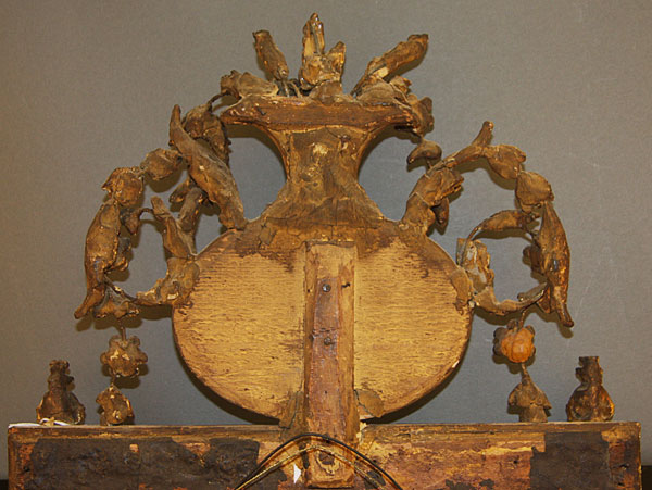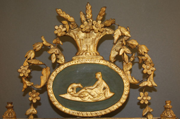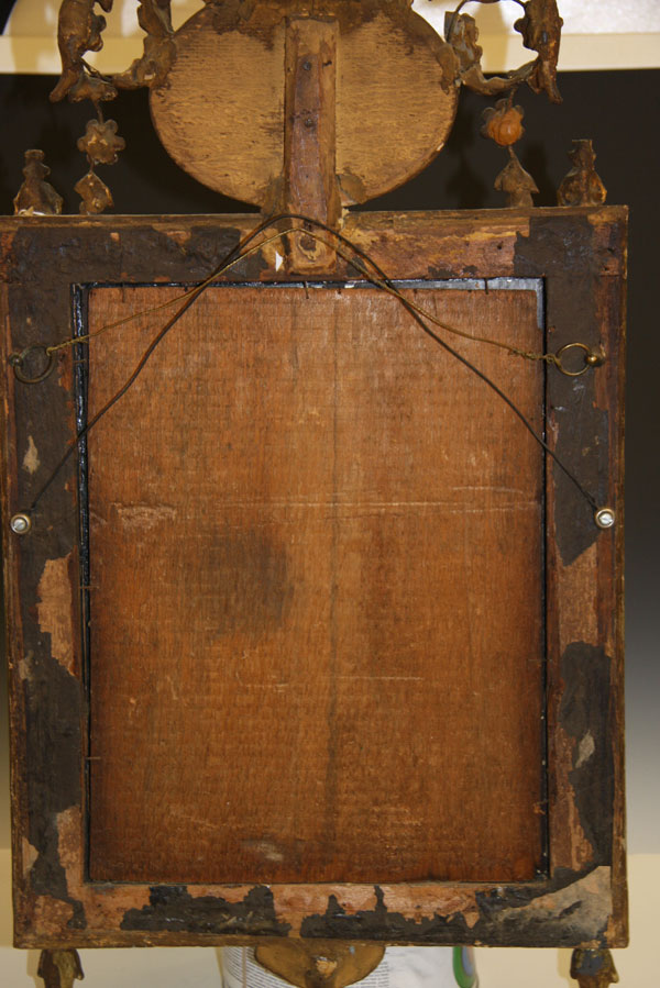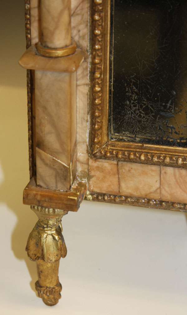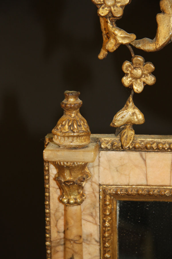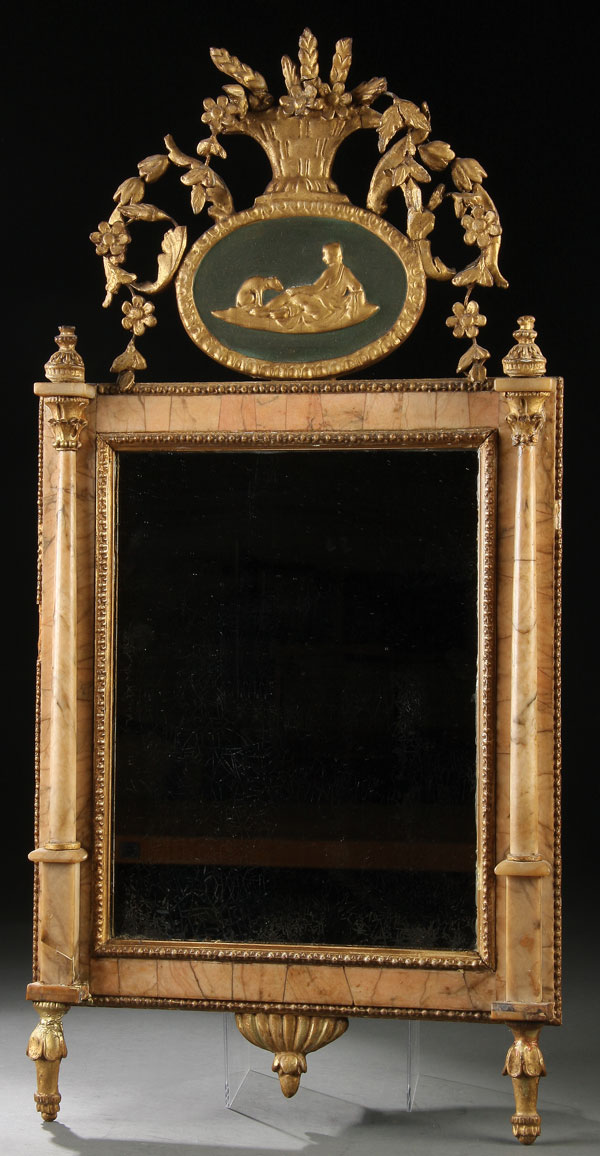 A FINE NEO-CLASSIC "BILBOA" WALL MIRROR, PROBABLY SPANISH LATE 18TH/EARLY 19TH CENTURY.Of rectangular form, the silvered mirror within a gilt gesso frame inset with light rose colored marble panels and turned columns below an embossed oval neo-classic medallion surmounted with a gilt gesso floral basket with scrolled openwork foliates. 30 inches x 14.75 inches (76 x 37.5 cm).