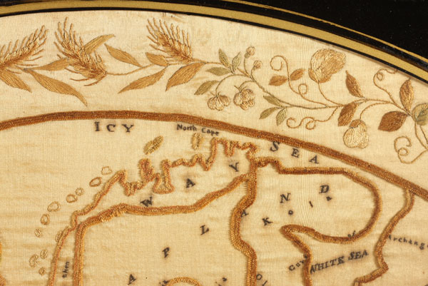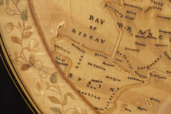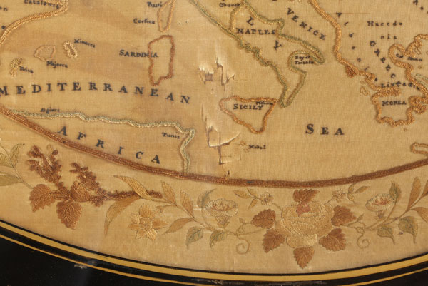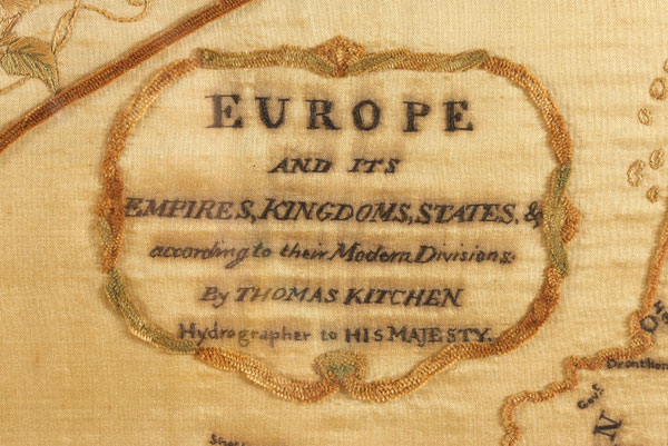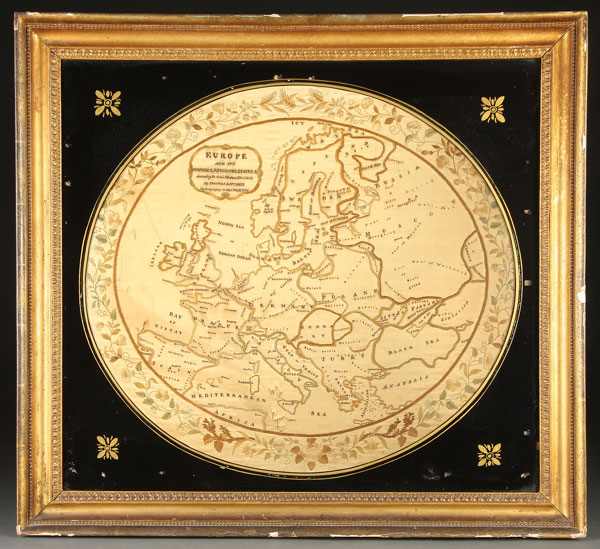 A GEORGE III SILKWORK EMBROIDERED MAP OF EUROPE , CIRCA 1800.Finely stitched after the original "Europe and its empires, kingdoms and states" by Thomas Kitchen, within a reverse painted glass and gilt wood frame. 27.5 inches x30 inches (69.8 cm x 76.5 cm).