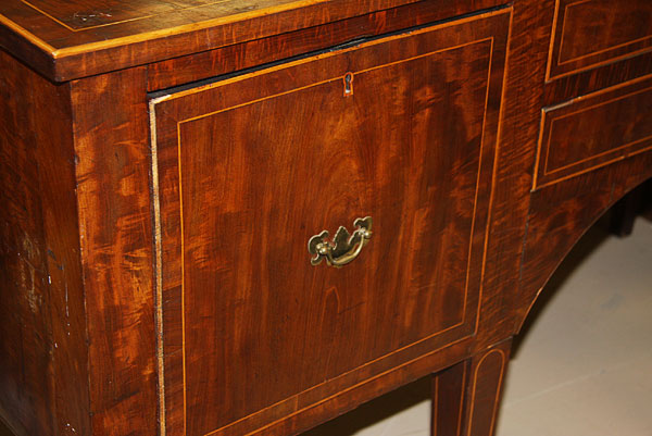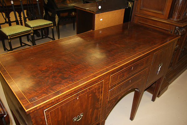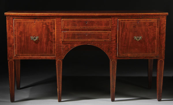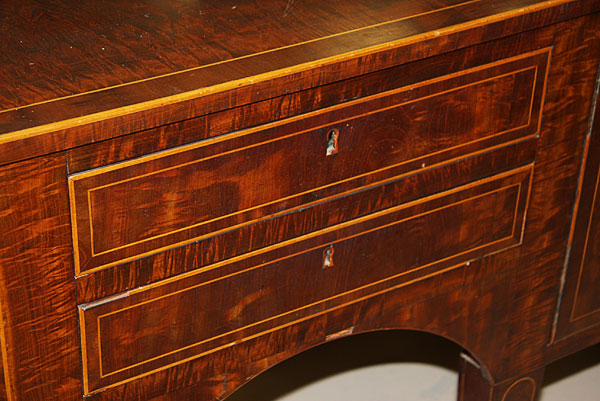 A HEPPLEWHITE INLAID MAHOGANY SIDEBOARD, CIRCA 1800.With flame mahogany top and satinwood band inlay above four drawers raised on tapered legs (slightly reduced). Height 34 inches (86.5 cm), length 60.5 inches (153 cm), depth 24 inches (61 cm).