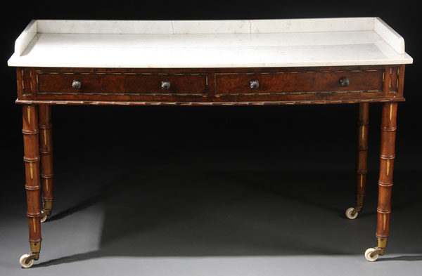 AN ENGLISH SHERATON "FAUX BAMBOO" TWO DRAWER MARBLE TOPPED COMMODE, 19TH CENTURY. The rectangular white marble top with short backsplash raised on a paneled burlwood two drawer base with carved bamboo beading heightened in gilt, raised on four bamboo form turned legs with porcelain castor terminals. Height 32 inches (81.4 cm), width 53.5 inches (135.8 cm), depth 23.5 inches (59.5 cm).