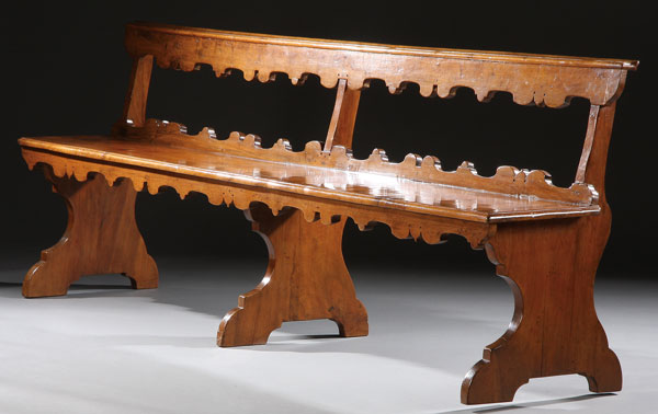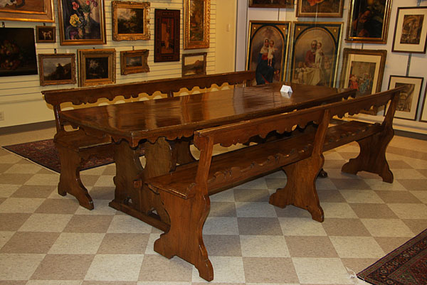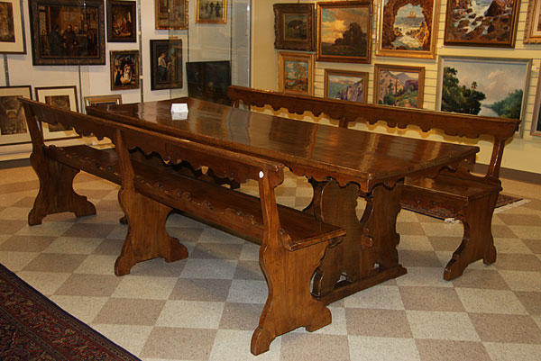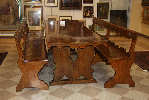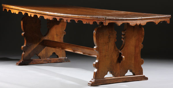 A VERY FINE CONTINENTAL WALNUT "CAVALIER'S" OR "MONK'S" TRESTLE TABLE AND BENCHES, LATE 17TH/EARLY 18TH CENTURY. The solid two board plank top with scalloped apron supported by two scalloped plank legs raised on bracket feet, joined by a central stretcher. Together with two matching full-length benches with scroll cut back rests. Length 103 inches (261.5 cm), width 34.5 inches (87.5 cm), height 31.5 inches (80 cm).