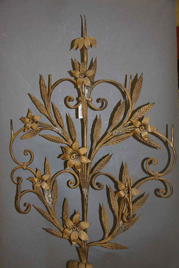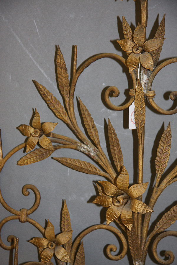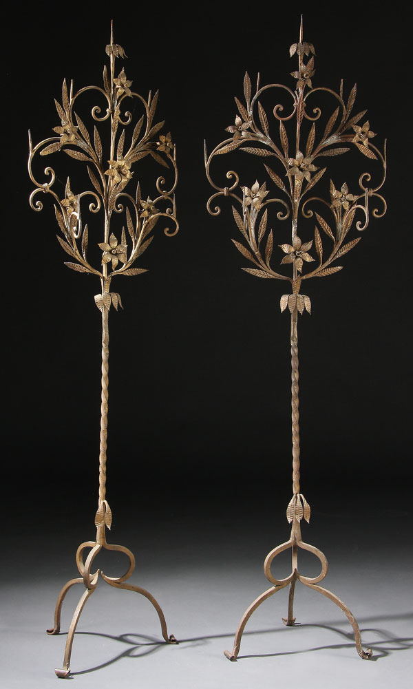 A VERY FINE PAIR OF SPANISH COLONIAL WROUGHT IRON SEVEN LIGHT CANDLE PRICKETS, 18TH CENTURY.With scrolled foliates and extending tooled flower heads, each containing seven candle spikes rising from a squared twist turned column with arched tripod legs terminating in flattened scrolled feet. Remnants of gilt finish. Height 67.25 inches (171 cm), width 20 inches (51 cm).