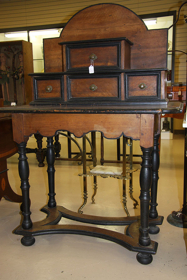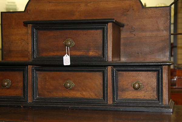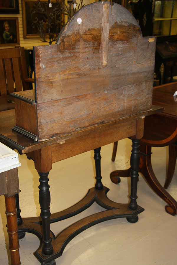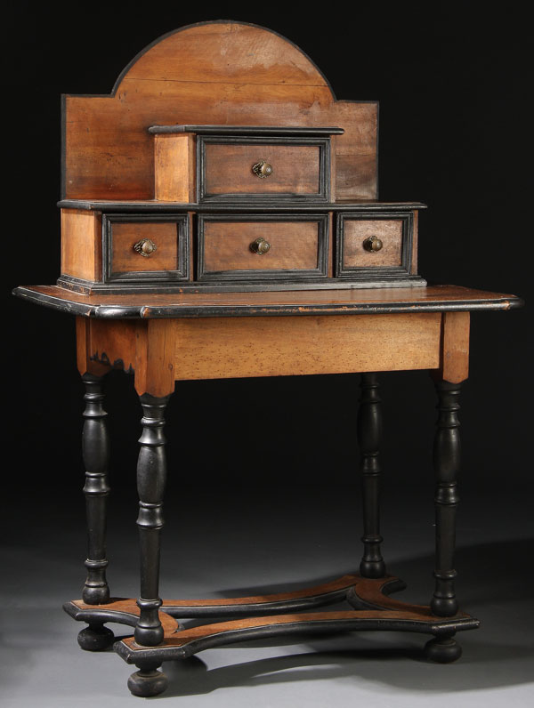 A DUTCH OR FLEMISH "WILLIAM AND MARY" STYLE SECRETARY CABINET, 18TH/19TH CENTURY.The four drawer paneled cabinet with arched backsplash resting on a rectangular walnut top with shaped corners raised on a four turn legged base with scallop carved skirt and concave form stretchers. Height 56.5 inches (143.5 cm), width 40.25 inches (102 cm), depth 24 inches (60.7 cm).
