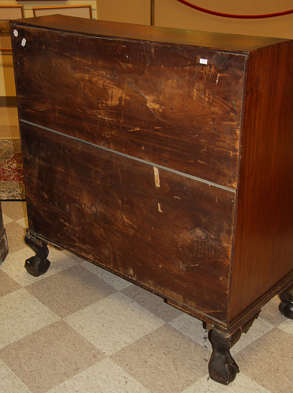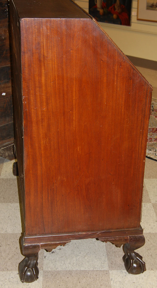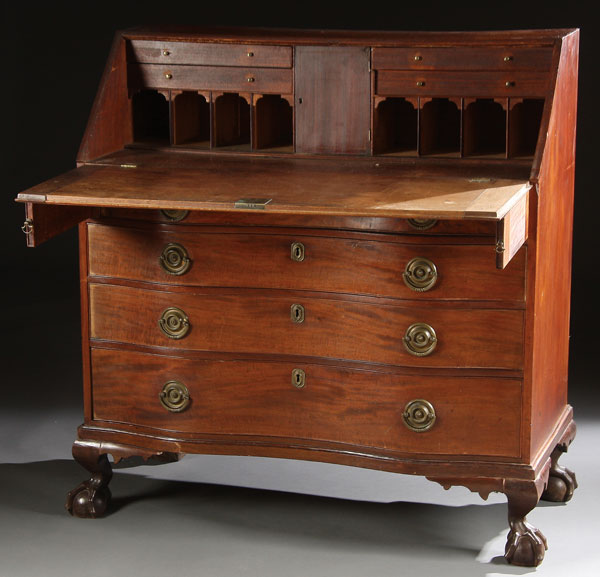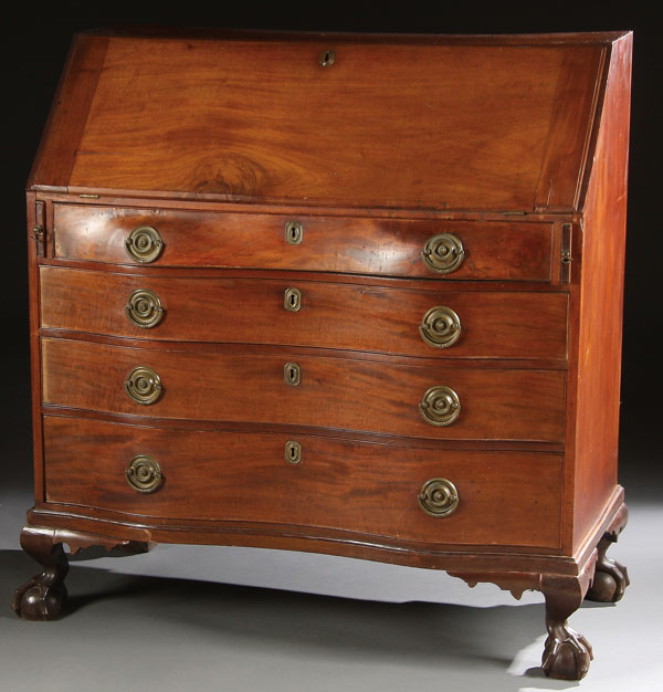 A VERY FINE AMERICAN CHIPPENDALE MAHOGANY SLANT-FRONT DESK, LAST QUARTER 18TH CENTURY.With slant front top opening to reveal interior pigeon holes and drawers above a four drawer serpentine base with brass pulls raised on carved claw and ball feet. Height 44.5 inches (113 cm), width 41.75 inches (106 cm), depth 21 inches (53.5 cm).