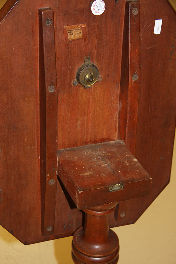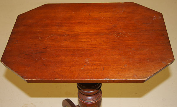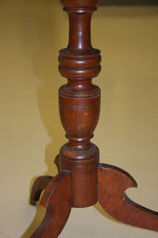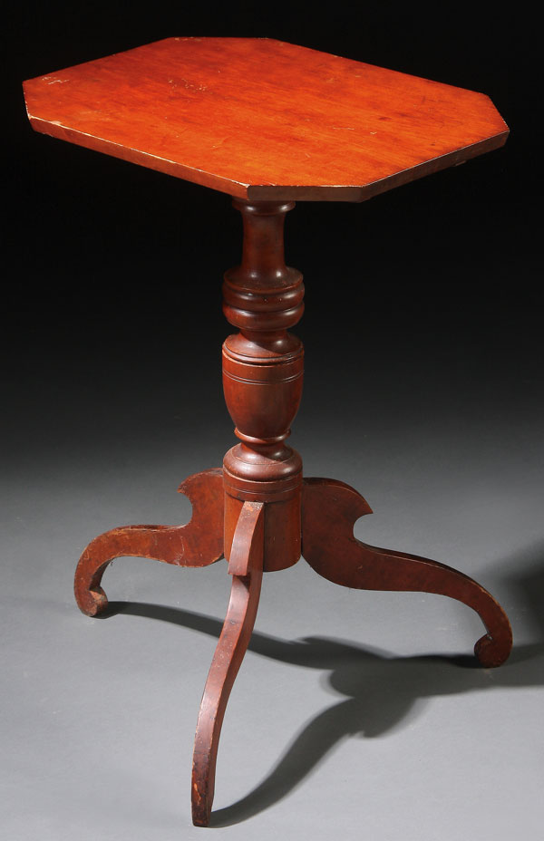 AN EARLY AMERICAN CHERRY WOOD TILTING TOP CANDLE STAND, EARLY 19TH CENTURY.With rectangular cut corner top raised on a tilting turned pedestal stand with three scrolled "bird's mouth" legs. The verso with remnants of paper tag inscribed "Huldah Morgan Skeele Dowry- 1829". With original finish. Height 28.25 inches (71.5 cm), length 19.5 inches (49.5 cm), width 15 inches (38 cm).