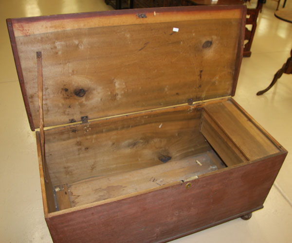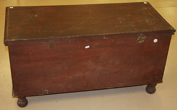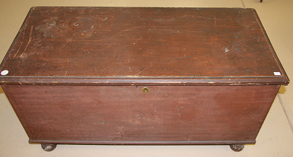 A VERY FINE EARLY AMERICAN SIX BOARD PINE BLANKET CHEST, CIRCA 1825.With original red oxide painted finish, raised on bun feet. Height 22 inches, width 42 inches, depth 19 inches.