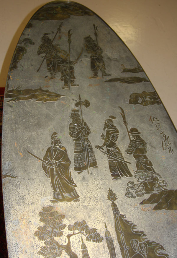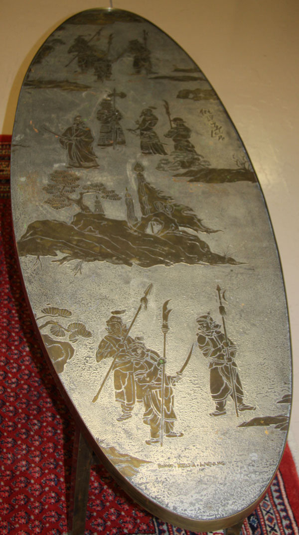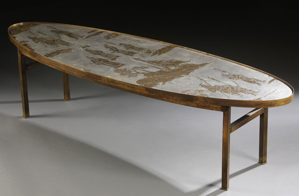 A VERY FINE PHILLIP & KELVIN LAVERNE "CHAN" ETCHED BRONZE OVAL COFFEE TABLE, MID 20TH CENTURY.The elongated oval top etched with a design of Chinese warriors on a pewter patinated ground, raised on four squared bronze legs. Etched signature lower center "Phillip Kelvin Laverne". Length 65 inches (165 cm), width 21.25 inches (54 cm), height 17 inches (43 cm).