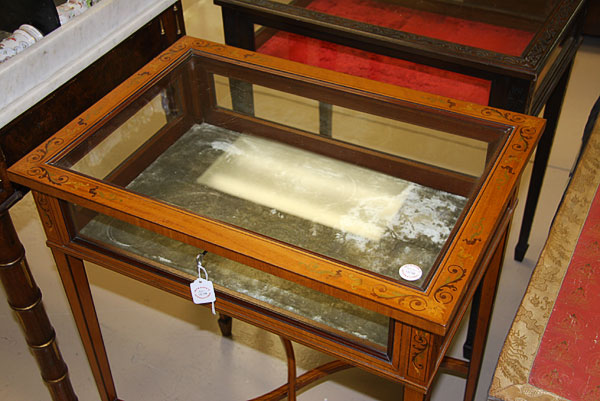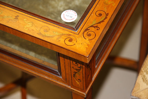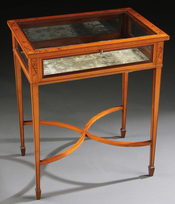 A VERY FINE FRENCH LOUIS XVI STYLE MARQUETRY TABLE DISPLAY CABINET, LATE 19TH/EARLY 20TH CENTURY.Of rectangular form with glazed side panels and top framed in paneled satinwood, inlaid with exotic polychromed foliate scrolls and raised on tapered legs joined with a scrolling X form stretcher. Height 29 inches (74 cm), width 24 inches (61 cm), depth 16.75 inches (42.5 cm).