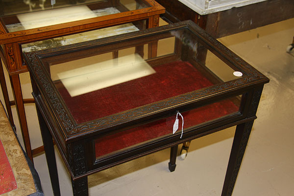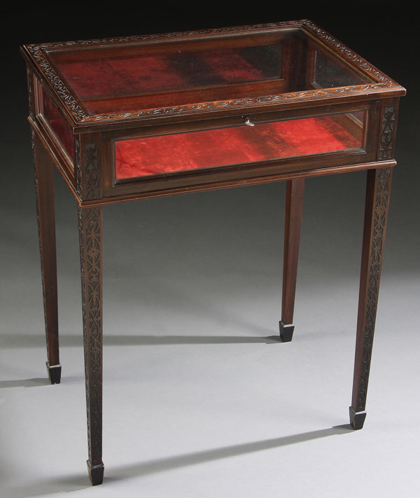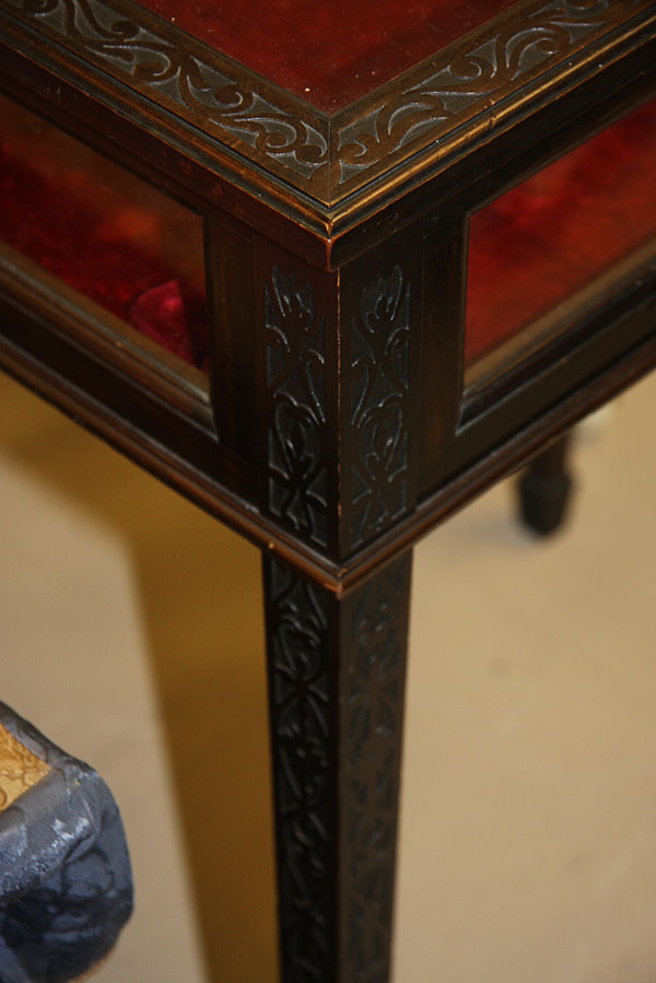 A FINE GOTHIC REVIVAL INTAGLIO CARVED WALNUT TABLE DISPLAY CABINET, LATE 19TH/EARLY 20TH CENTURY.Of rectangular form with four glazed side panels and top, framed with recess carved scrolled foliates raised on four tapering legs with scrolled foliate carved outer panels. Height 29 inches (74 cm), width 23.5 inches (59.5 cm), depth 16.5 inches (42 cm).
