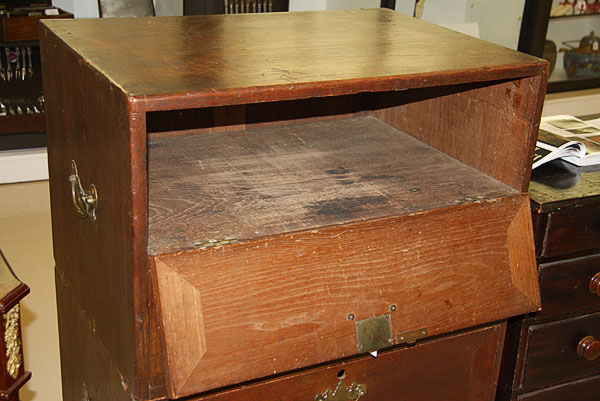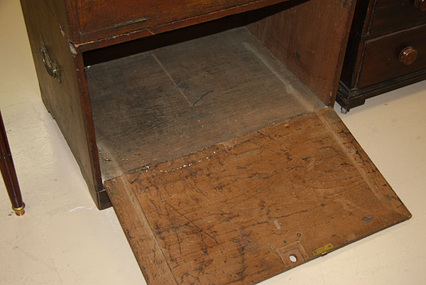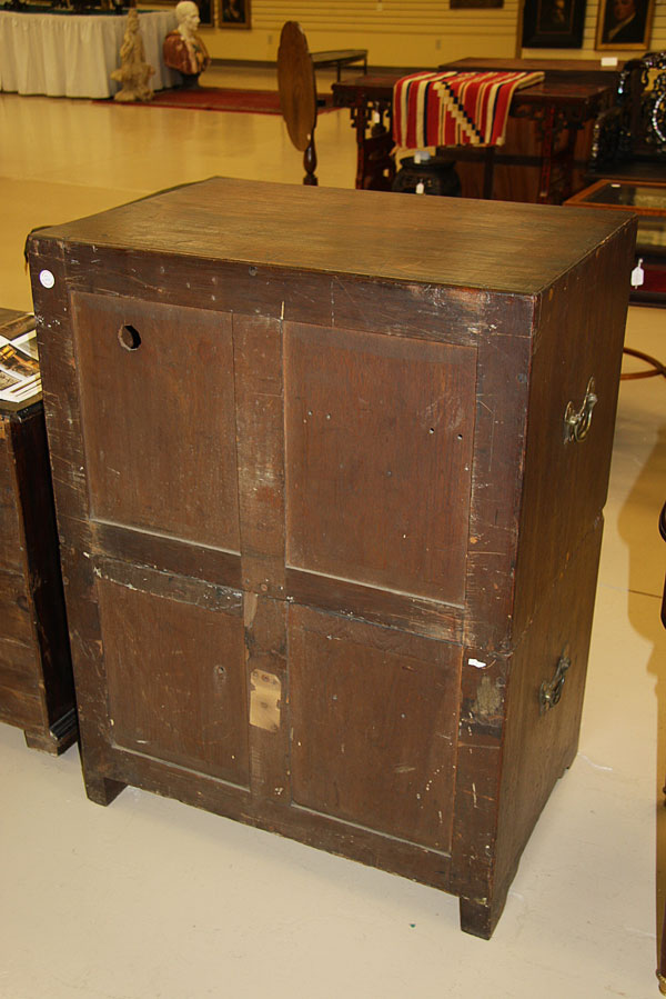 A GOOD GEORGE III WALNUT TWO SECTION CAMPAIGN CHEST.Of stacking rectangular form raised on bracket feet with three drop front panel doors mounted with original brass bail handles and locks, each end panel with original brass bail handles for transportation. Height 41 inches (104 cm), width 30.5 inches (77.5 cm), depth 21.5 inches (54.5 cm).