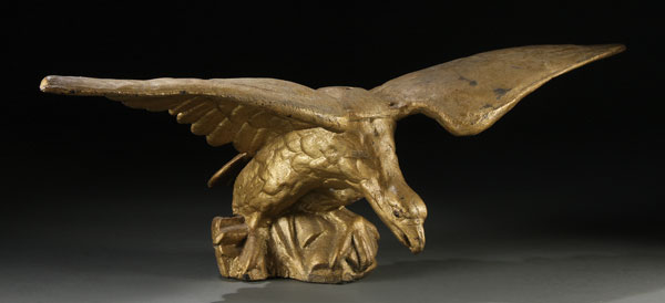 A LARGE CAST IRON AND GOLD PAINTED ARCHITECTURAL EAGLE, LATE 19TH CENTURY.Depicted perched on a rockery plinth with wings spread. Length (wingspan) 30.75 inches (78 cm), height 10.5 inches (26.5 cm).