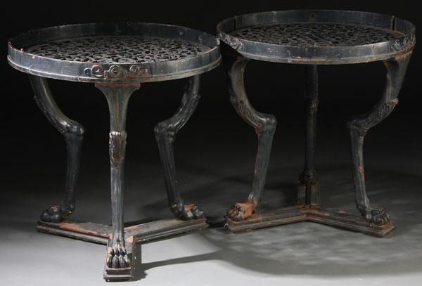 A PAIR OF UNIQUE VICTORIAN CAST IRON PATIO TABLES, 19TH CENTURY. With tripod anamorphic legs terminating in claw feet below a circular skirt with embossed scrolled foliate and rosette decoration surrounding a removable reticulated scrolled recessed grate. Height 29 inches (74 cm), diameter 28 inches (71 cm).