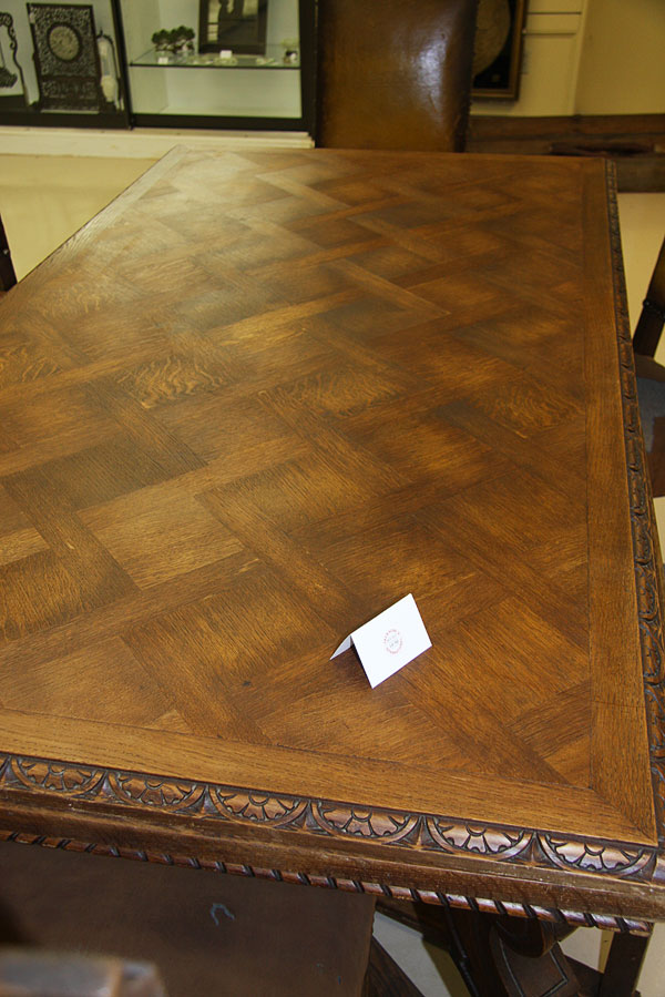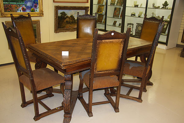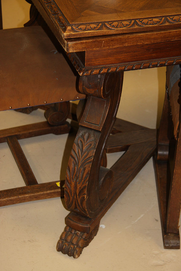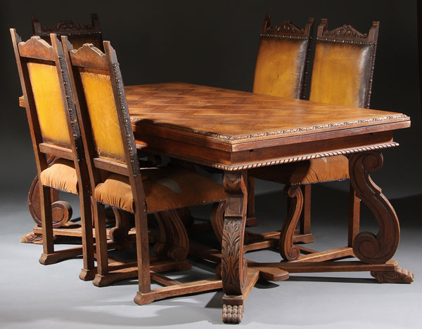A FRENCH PROVINCIAL SEVEN PIECE OAK DINING SET IN THE RENAISSANCE TASTE, LATE 19TH/EARLY 20TH CENTURY.Comprising a draw leaf rectangular table raised on acanthus carved scrolled legs joined by a double Y form stretcher with carved claw feet and six matching leather upholstered side chairs with carved acanthus crests flanked by supports with scrolled terminals. Length 72 inches (183 cm), width 39 inches (100 cm), height 31 inches (79 cm).